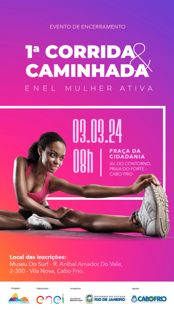 Cabo Frio vai se vestir de rosa neste domingo (3) com o Projeto Mulher Ativa que vai promover a 1ª Corrida e Caminhada Enel Mulher Ativa, na orla da Praia do Forte. A concentração será na Praça da Cidadania, às 8h. A iniciativa marca o encerramento do projeto que é uma iniciativa que tem patrocínio da Enel, via Lei Estadual de Incentivo ao Esporte.