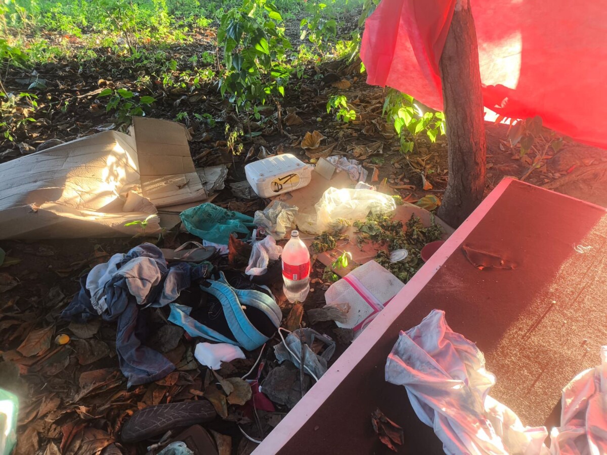Entre os materiais estavam papelão, garrafas plásticas, embalagens descartáveis, restos de alimentos, roupas, calçados e objetos pessoais, além de itens utilizados para abrigo, como lona.