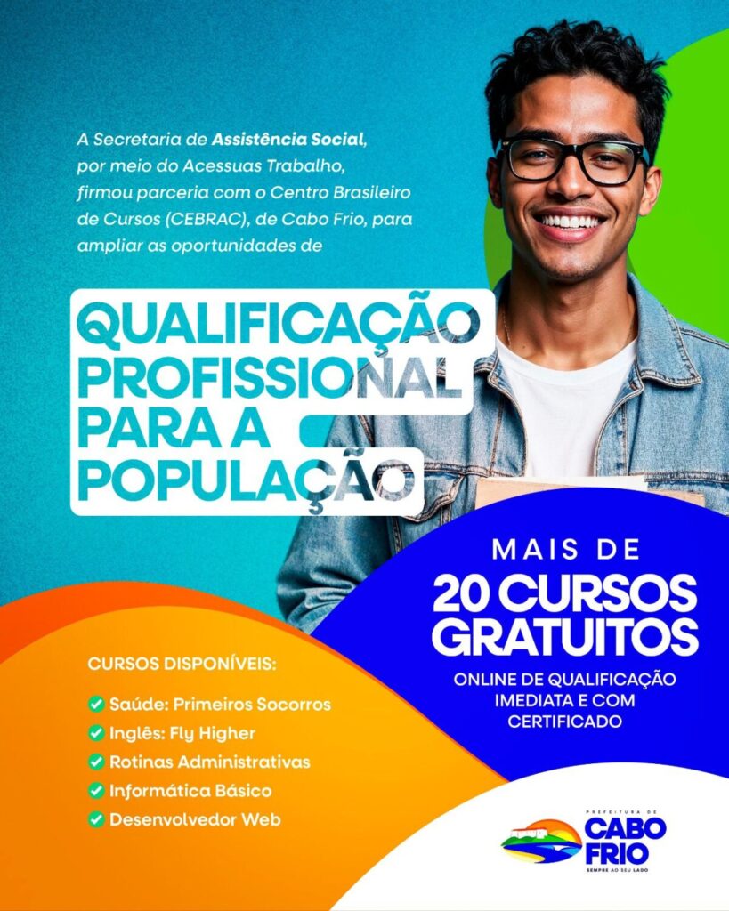 A Secretaria de Assistência Social, por meio do Acessuas Trabalho, firmou parceria com o Centro Brasileiro de Cursos (CEBRAC), de Cabo Frio, para ampliar as oportunidades de qualificação para a população em situação de vulnerabilidade, de 14 a 64 anos, inscritas em qualquer unidade do Centro de Referência de Assistência Social (CRAS), de Cabo Frio.