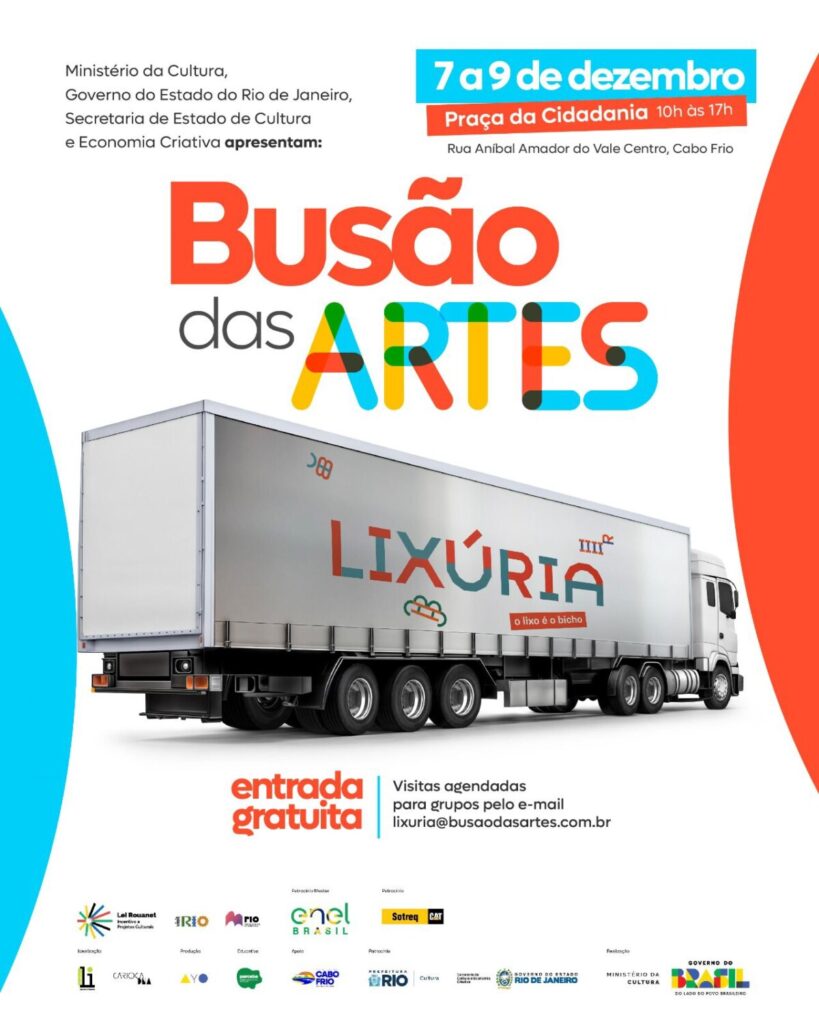 O projeto oferece atividades abertas ao público em geral e uma programação especial para escolas públicas e privadas. Com patrocínio da Enel Rio e Sotreq, o Busão das Artes conta com apoio da Prefeitura de Cabo Frio e integra a programação cultural promovida pelo Governo do Estado do Rio de Janeiro em comemoração à COP30, realizada no Brasil em 2025.