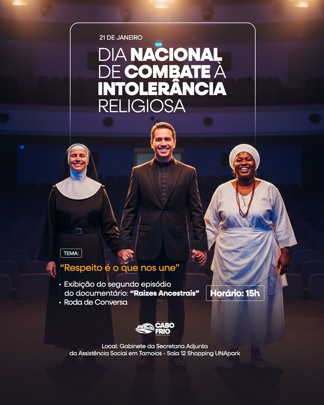 Em alusão ao 21 de janeiro, Dia Nacional de Combate à Intolerância Religiosa, a Prefeitura Municipal de Cabo Frio, por meio da Secretaria Municipal de Cultura, promove, nesta quarta-feira (21), uma programação especial com o tema “Respeito é o que nos une”, reforçando a importância do diálogo, da diversidade e da liberdade de crença.