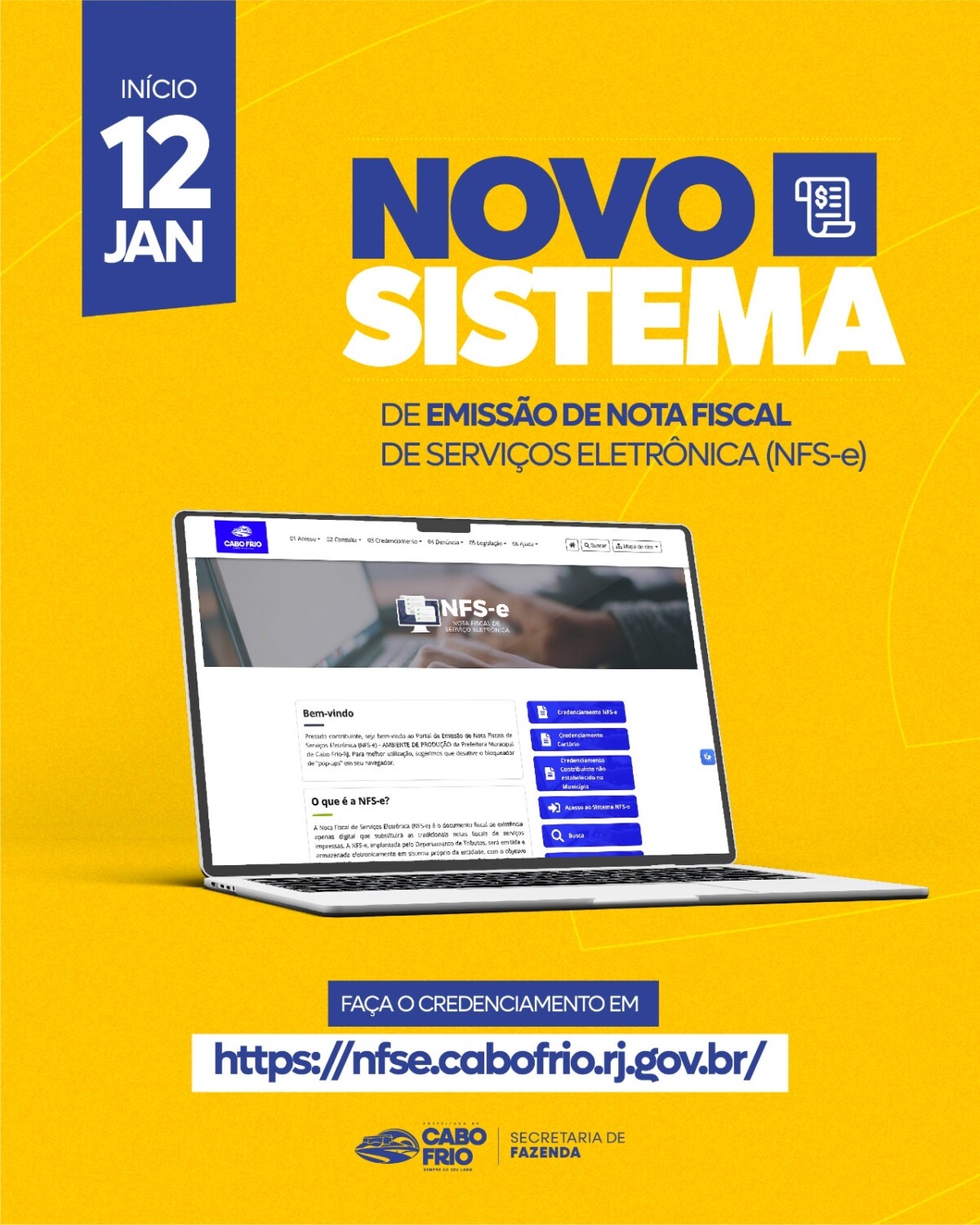 O atual sistema será desativado nesta sexta-feira (9) para migração dos dados, ficando fora do ar durante o próximo fim de semana. Antes disso, os contribuintes precisam se credenciar no novo sistema, acessando o link https://nfse.cabofrio.rj.gov.br.