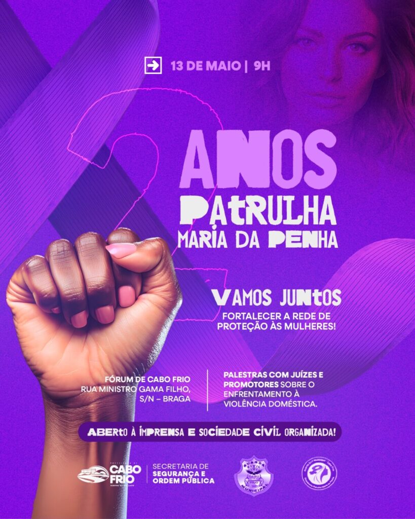 Nesta terça-feira (13), às 9h, o Fórum de Cabo Frio será palco de um evento especial em comemoração aos dois anos de atuação da Patrulha Maria da Penha da Guarda Civil Municipal. A iniciativa é promovida pela Prefeitura de Cabo Frio, por meio da Secretaria Municipal de Segurança e Ordem Pública.
