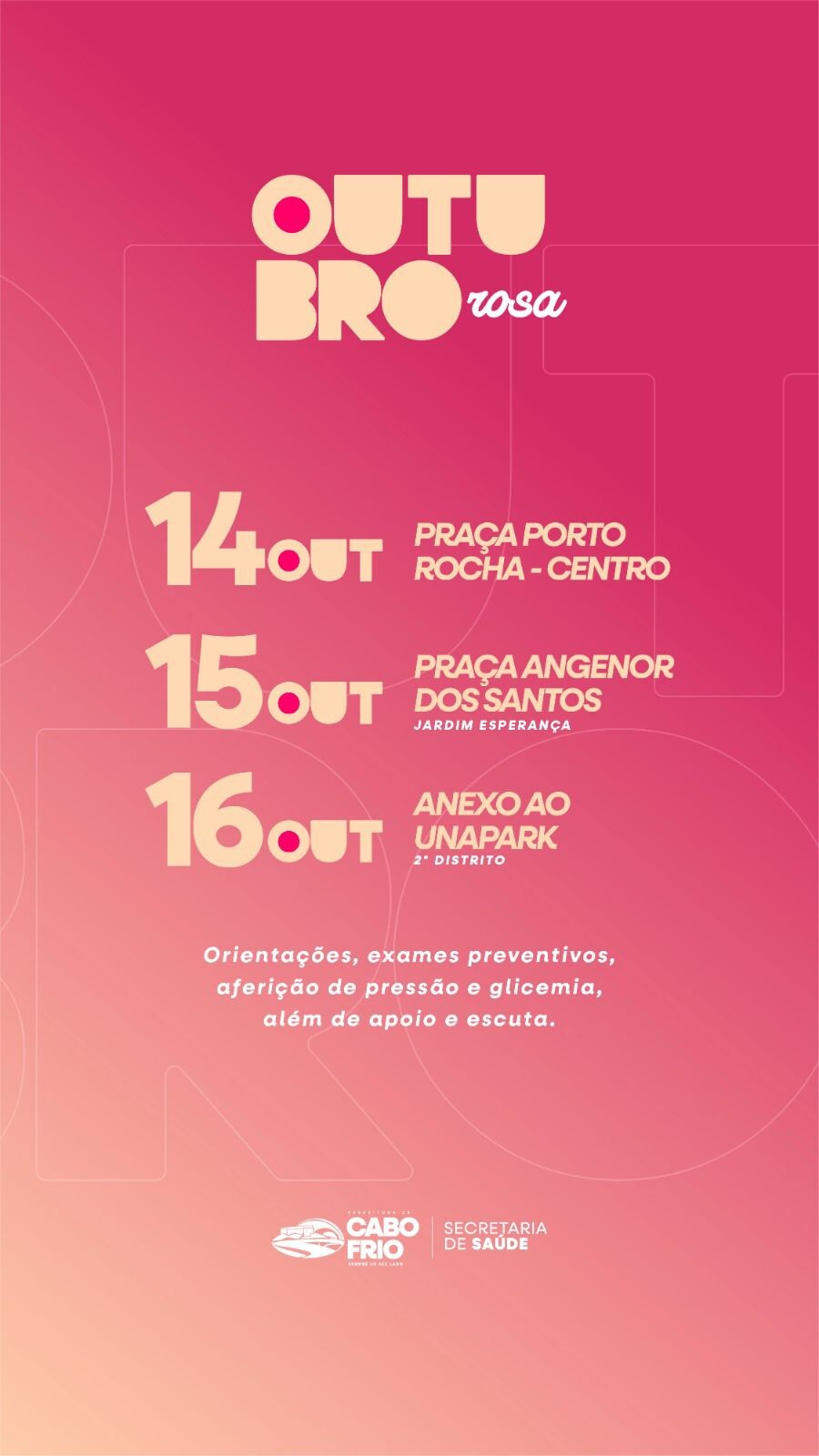 A Prefeitura de Cabo Frio convida todas as mulheres a participarem das atividades do Outubro Rosa e reforça o compromisso do município com o cuidado, o amor e a esperança.