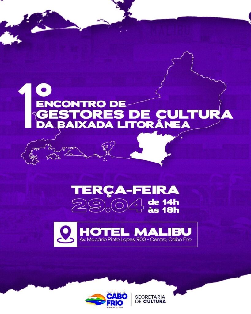A cidade de Cabo Frio realiza o 1º Encontro de Gestores de Cultura da Baixada Litorânea. O importante evento para o desenvolvimento cultural da região acontece no dia 29 de abril, das 14h às 18h, no Hotel Malibu, e reúne os secretários e representantes da área cultural dos dez municípios que compõem a Baixada Litorânea.