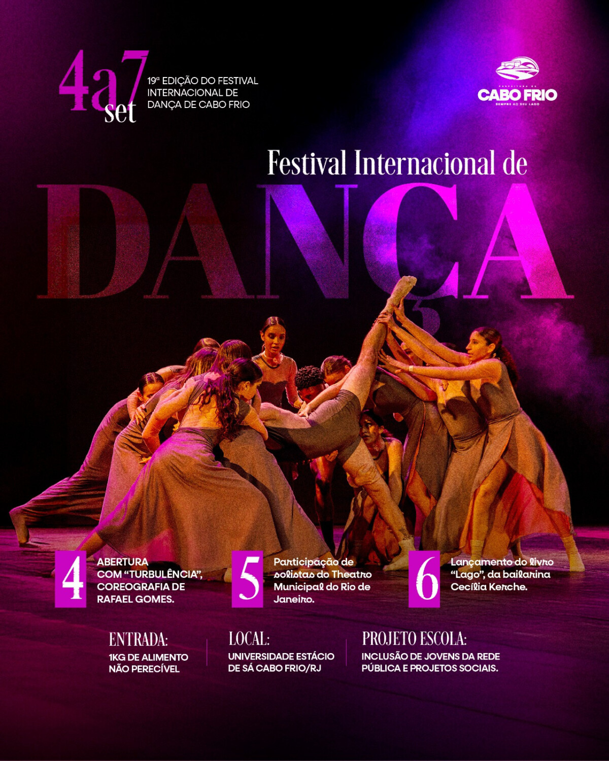 De 4 a 7 de setembro, Cabo Frio será palco da 19ª edição do Festival Internacional de Dança, um dos maiores eventos do gênero no Brasil. O festival será realizado na Universidade Estácio de Sá, conta com o apoio da Prefeitura de Cabo Frio e o patrocínio do Conselho Municipal de Turismo, e promete movimentar a cidade com arte, cultura, turismo e talentos de diversas partes do mundo.