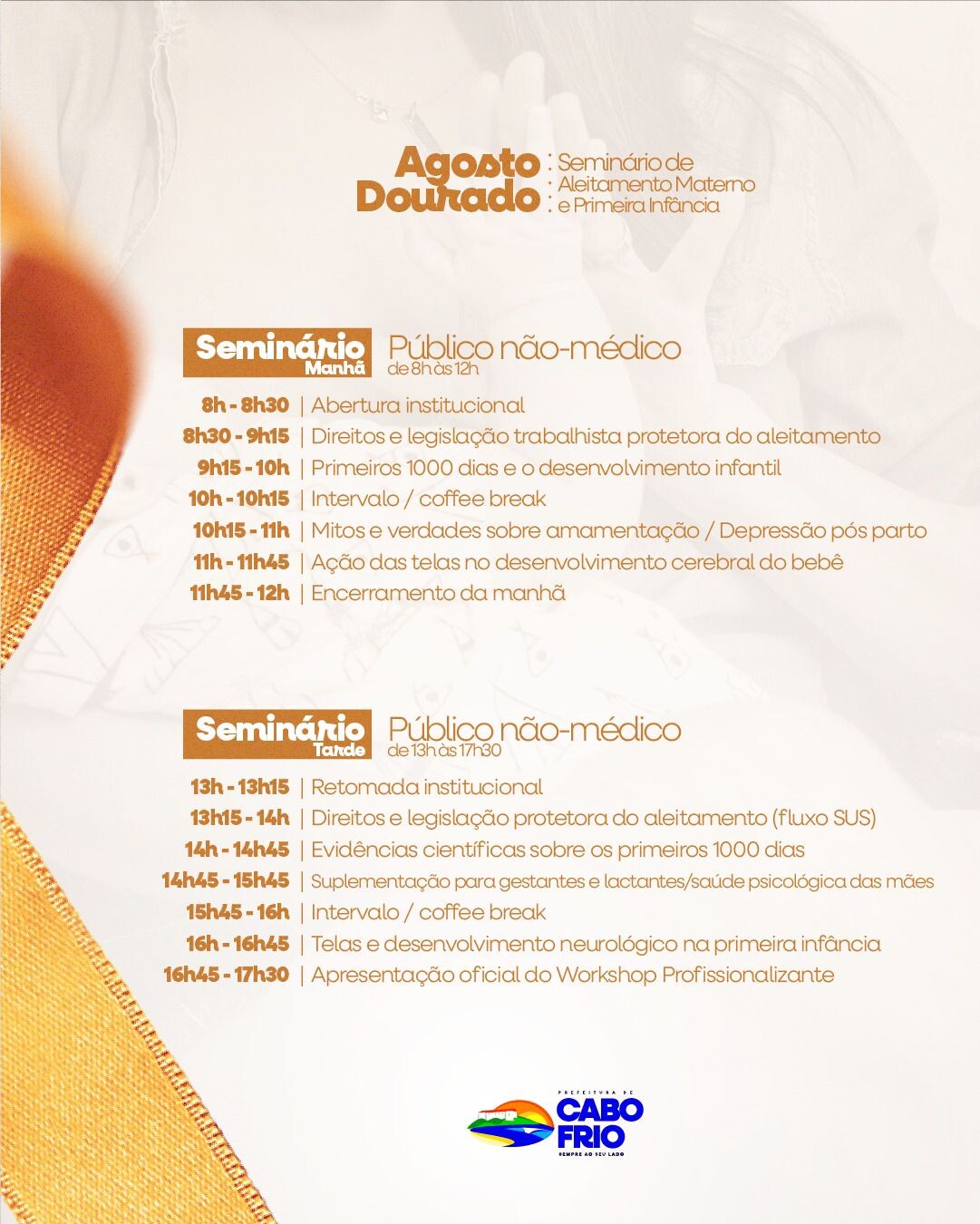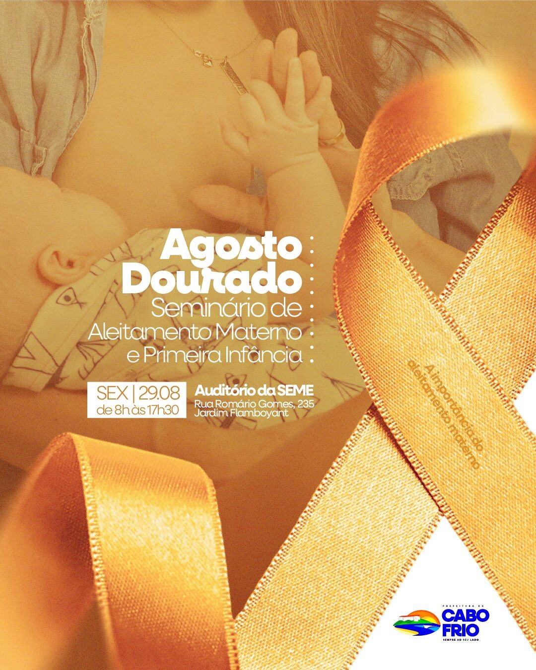 A Prefeitura de Cabo Frio, por meio da Secretaria de Assistência Social e da Coordenadoria-Geral da Criança e do Adolescente (COGECRIA), em parceria com a Coordenação Municipal de Pediatria da Secretaria de Saúde, promove na próxima sexta-feira (29), das 8h às 17h, no Auditório da Secretaria de Educação, o Seminário sobre a Primeira Infância e o Aleitamento Materno.