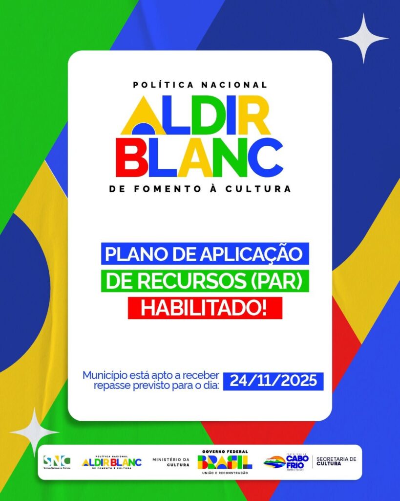 Cabo Frio deu mais um passo importante para o fortalecimento da cultura local. O município teve seu Plano de Aplicação de Recursos (PAR) habilitado no âmbito da Política Nacional Aldir Blanc (PNAB) e aguarda o repasse de R$ 1.525.631,81, previsto para o dia 24 de novembro.