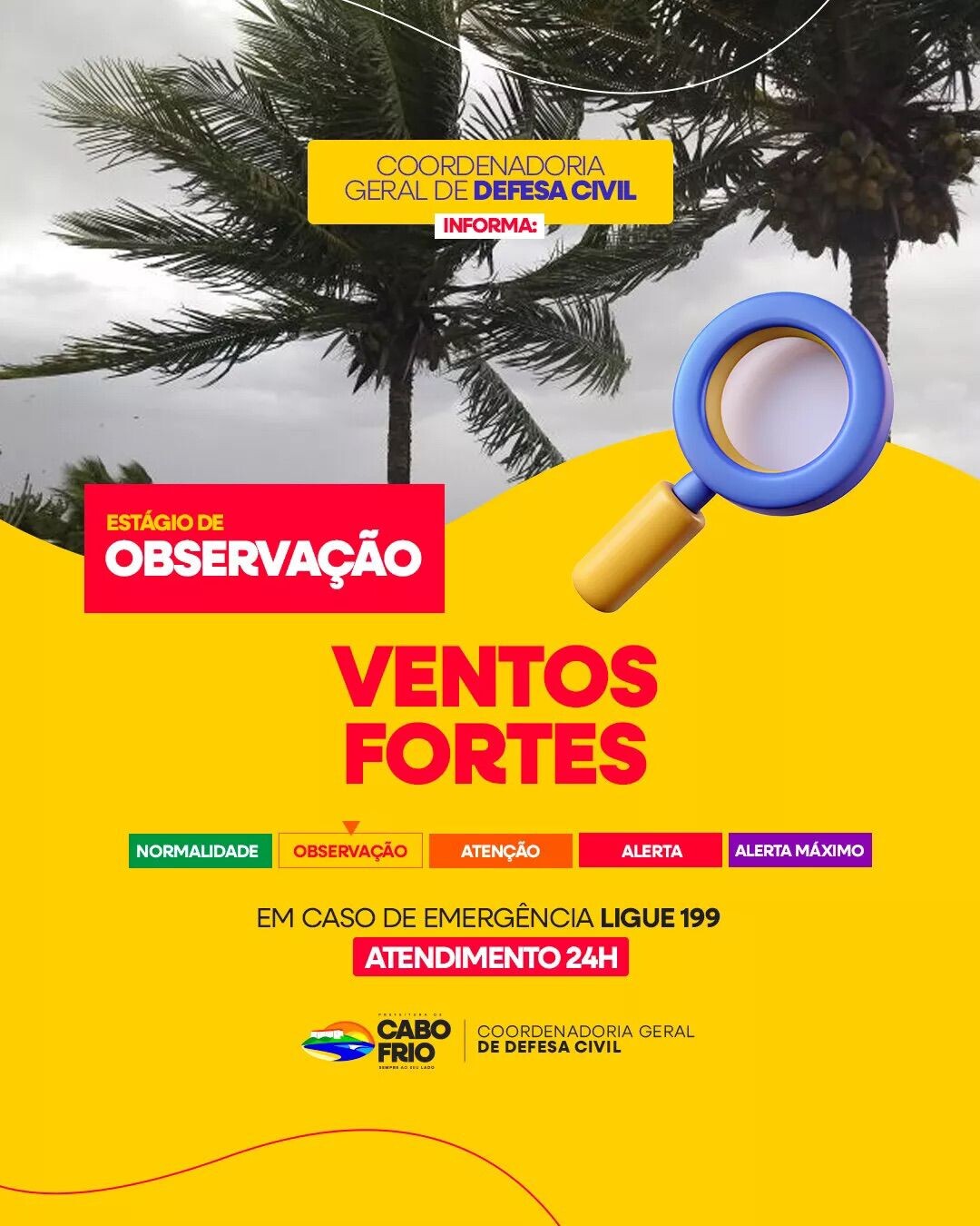 Defesa Civil de Cabo Frio alerta para incidência de ventos moderados a fortes