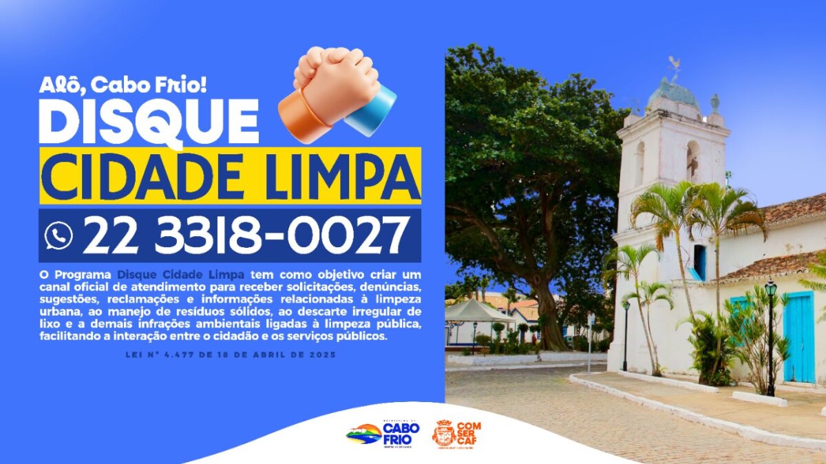 A Companhia de Serviços de Cabo Frio (Comsercaf) lançou o Disque Cidade Limpa, um canal oficial de atendimento criado para fortalecer a interação entre a população e os serviços públicos de limpeza urbana. A iniciativa tem como objetivo facilitar o envio de denúncias, reclamações, sugestões e informações sobre o descarte irregular de resíduos e outras demandas relacionadas à limpeza pública.