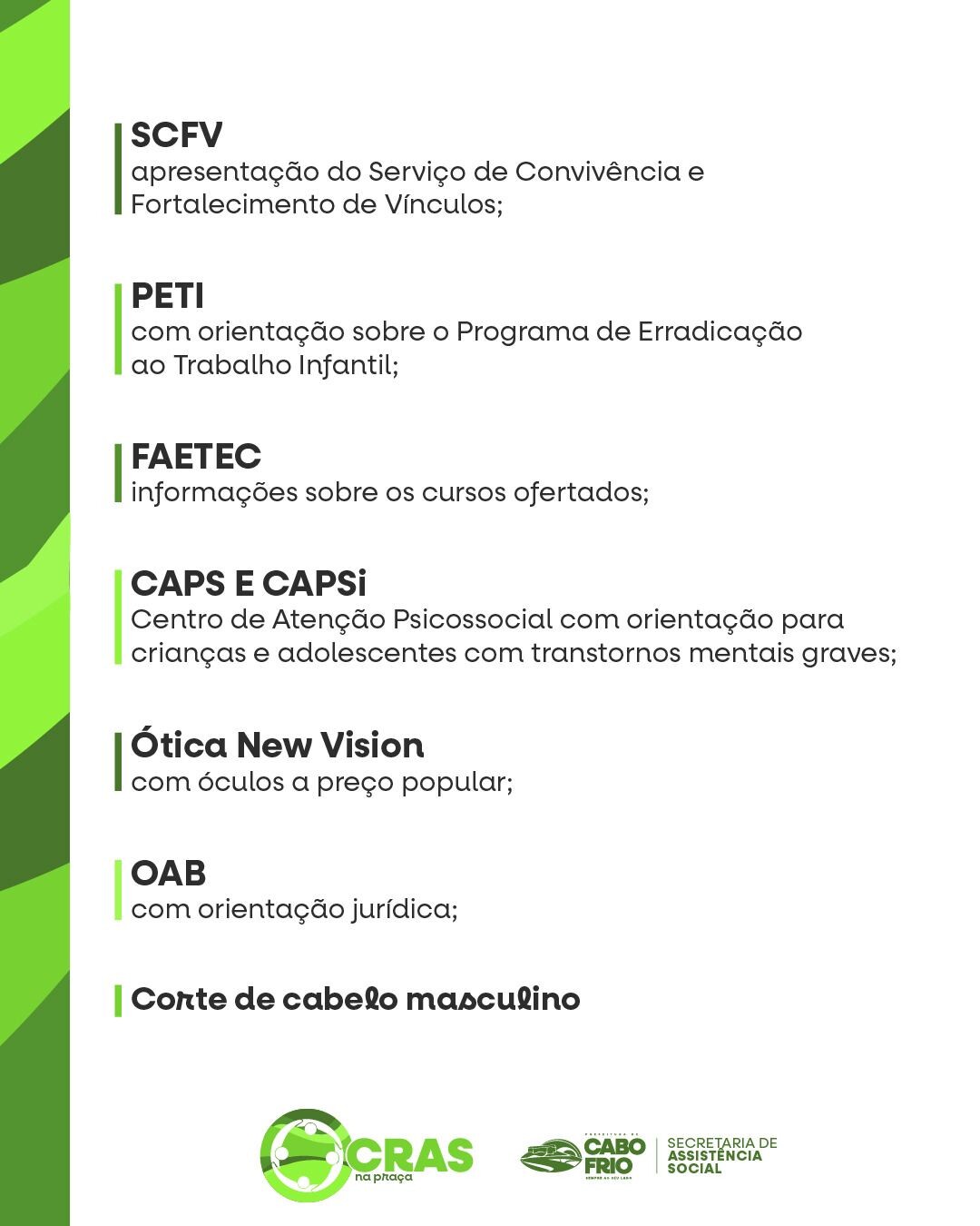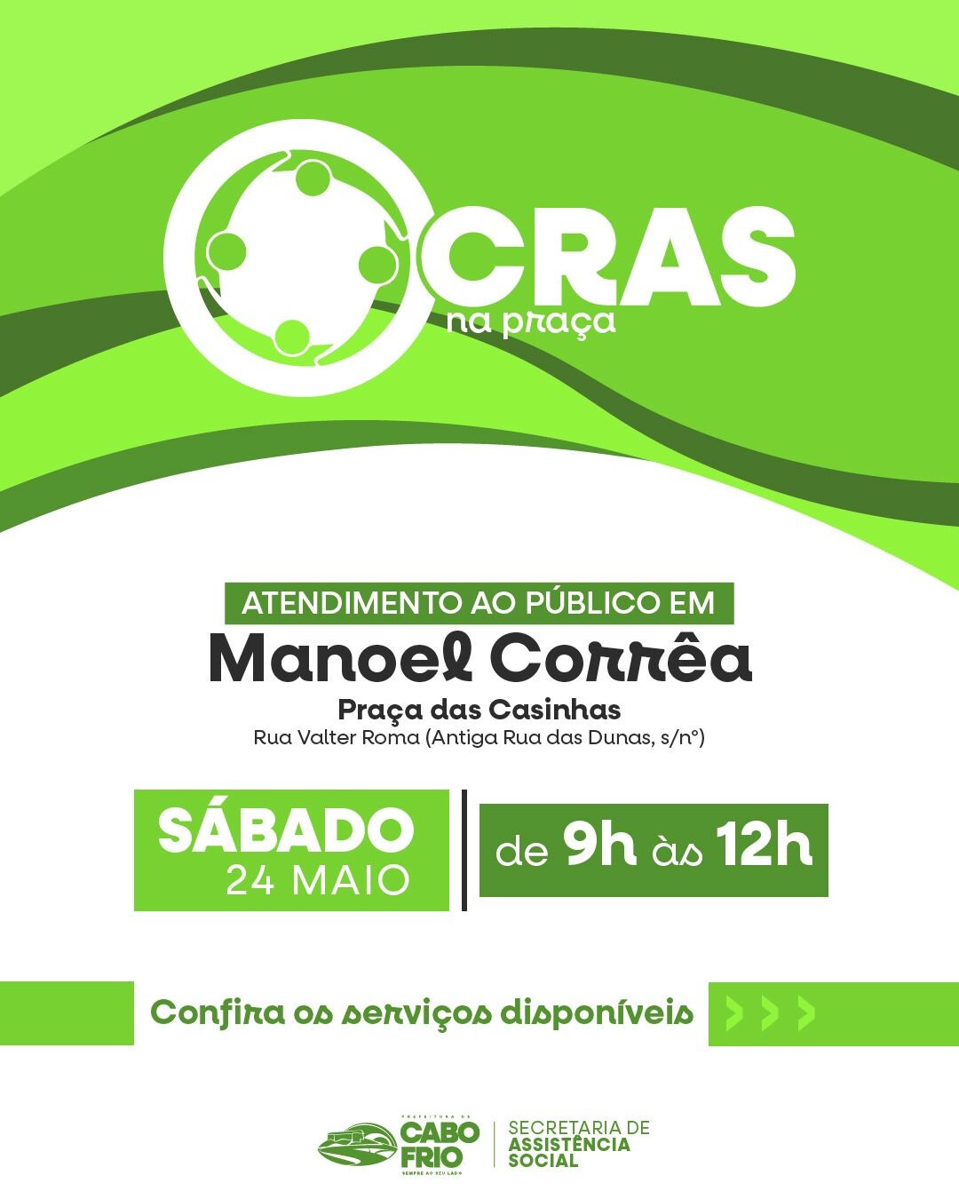 A Secretaria de Assistência Social de Cabo Frio, por meio da Superintendência de Proteção Social Básica, realiza no sábado (24), das 9h às 12h, uma programação especial com serviços gratuitos para a população, na Praça Manoel Correa.