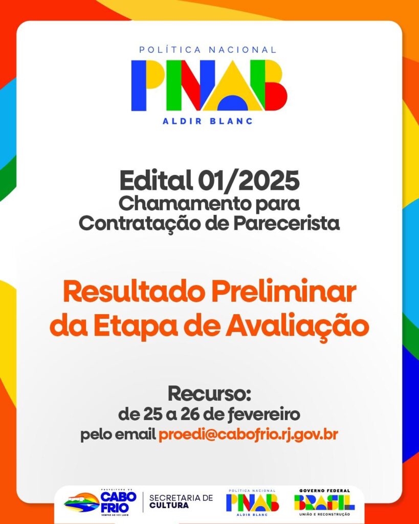 A Secretaria Municipal de Cultura de Cabo Frio publicou, nesta segunda-feira (24), o resultado preliminar da etapa de avaliação do Edital de Chamamento Público nº 01/2025, que tem como objetivo o credenciamento de pareceristas para a análise de projetos culturais financiados pela Política Nacional Aldir Blanc (PNAB). O período para interposição de recursos começa nesta terça-feira (25) e termina na quarta-feira (26), e a solicitação deve ser feita pelo e-mail: proedi@cabofrio.rj.gov.br.