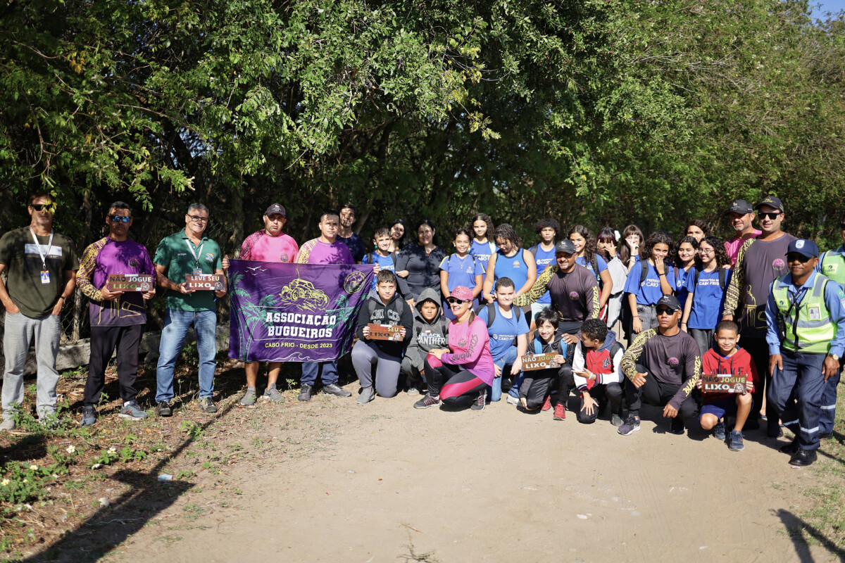 Uma grande ação de limpeza e educação ambiental marcou a manhã desta sexta-feira (8), na Vila do Sol, em Cabo Frio. Alunos da rede municipal, membros da Associação de Bugueiros e equipes da Prefeitura, da Companhia de Serviços de Cabo Frio (Consercaf) e do Aeroporto Internacional de Cabo Frio se uniram em um mutirão em prol do cuidado e da preservação da estrada do aeroporto, às margens do Parque Estadual da Costa do Sol. A iniciativa integra o programa “Cabo Frio Educada”, promovido pela Secretaria Municipal de Meio Ambiente, que visa fortalecer a consciência cidadã e ambiental por meio de ações educativas e práticas em espaços públicos do município. A ação também contou com o apoio da Secretaria Municipal de Educação e de equipes da Mobilidade Urbana.