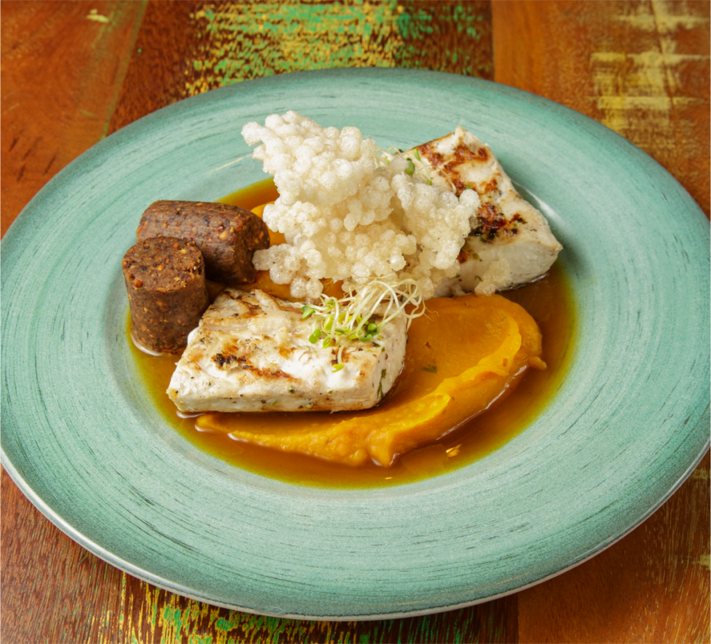 Dourado na cama de purê de moranga com cabotiá, pérolas de sagu com paçoca de banana-da-terra, coco e amendoim, ao molho de aroeira,