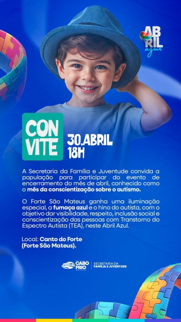 A ação é coordenada pela Secretaria da Família e Juventude, em parceria com a Secretaria-Adjunta de Políticas Públicas da Pessoa com Deficiência e Autismo, e conta com o apoio da Associação de Pais e Amigos dos Excepcionais (APAE-Cabo Frio). O evento marca o encerramento das atividades desenvolvidas ao longo do mês de abril, alusivas ao Dia Mundial e ao Mês de Conscientização sobre o Autismo.