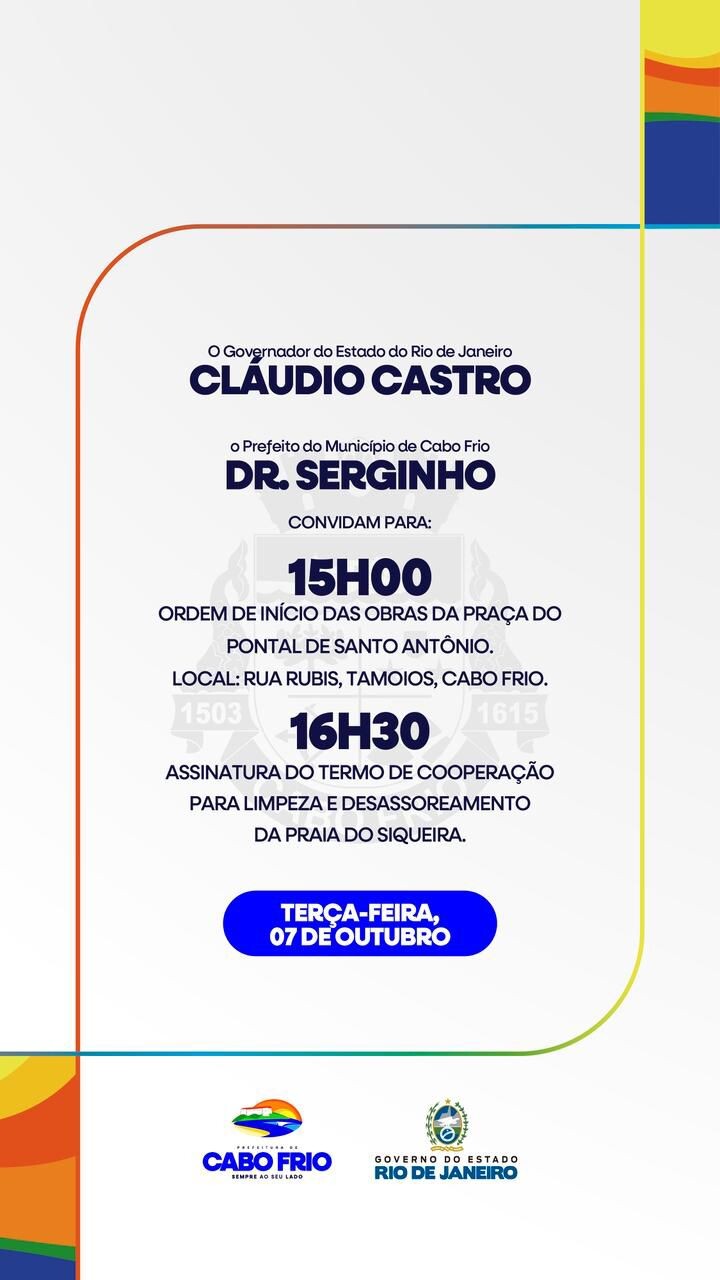 O município de Cabo Frio recebe, nesta terça-feira (7), a visita do governador do Estado do Rio de Janeiro, Cláudio Castro, para o anúncio de duas importantes obras de infraestrutura e meio ambiente: a revitalização da Praça do Pontal de Santo Antônio, em Tamoios, e a limpeza e o desassoreamento da Praia do Siqueira. A agenda será realizada com o prefeito Dr. Serginho, marcando um novo ciclo de avanços para a cidade.