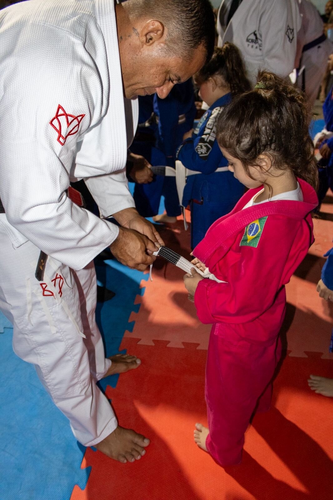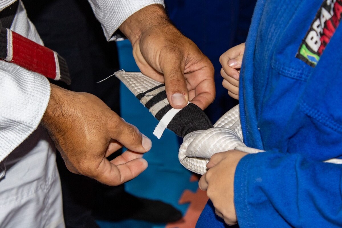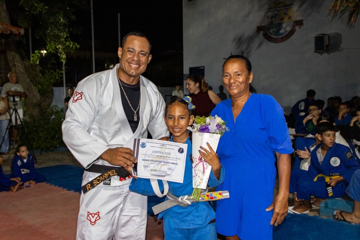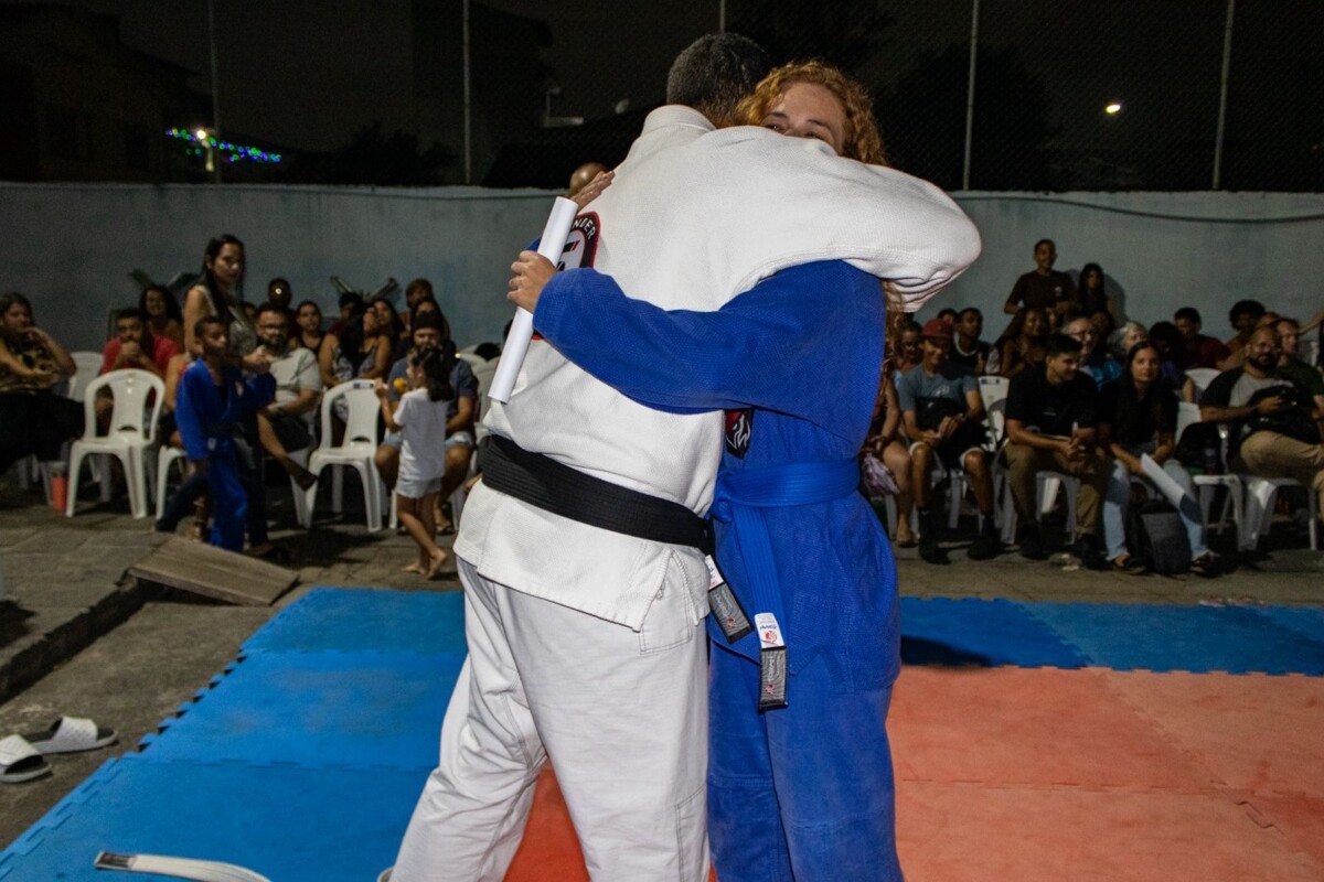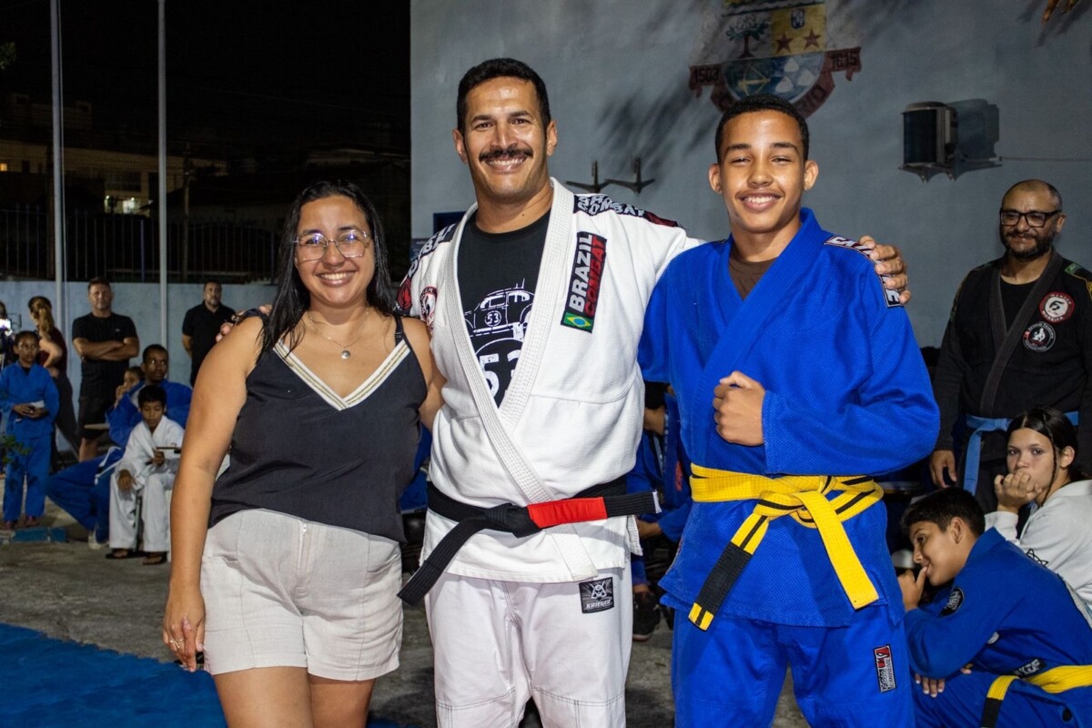 O filho dela, Gabriel, falou sobre a importância do esporte na sua rotina. “Eu acho o jiu-jitsu muito bom para aprender os golpes, mudar de faixa e ganhar grau. E hoje eu ganhei grau. Estou muito feliz”, disse.