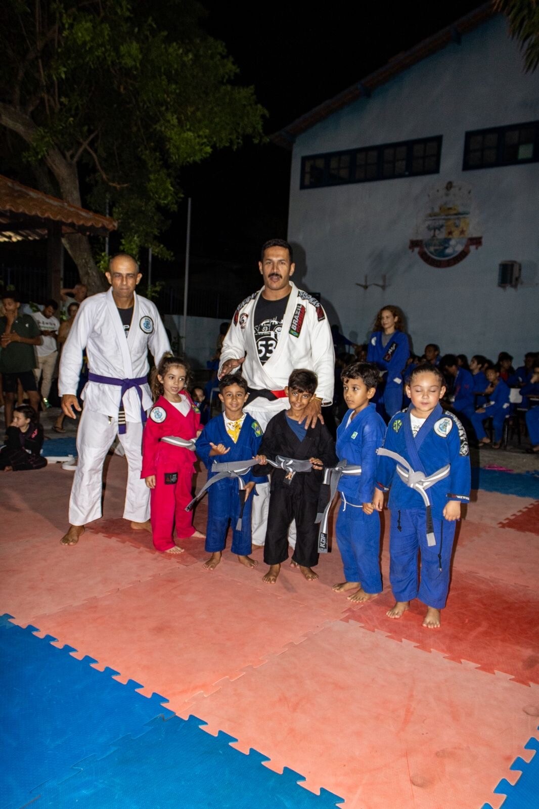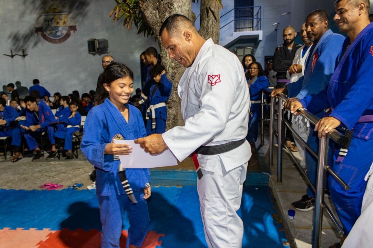 Durante a cerimônia, 65 alunos receberam grau e 12 participaram da troca de faixa. Também houve a devolução simbólica da faixa do aluno Miguel Carvalhaes, reforçando que o bom comportamento, o desempenho escolar e a postura em casa fazem parte dos critérios para permanência no projeto.