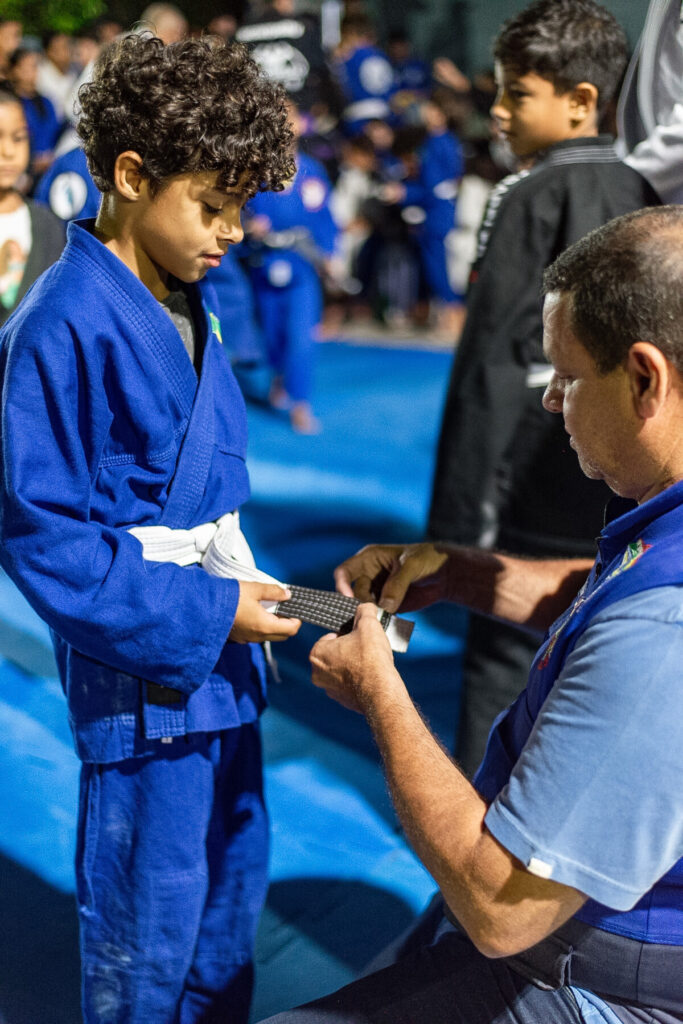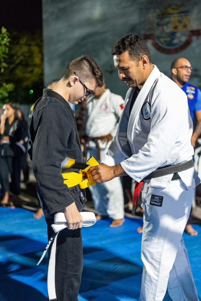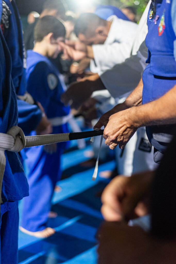 Ao todo, cerca de 60 alunos participaram da cerimônia. Dez deles conquistaram novas faixas, enquanto os demais receberam graus, marcos que simbolizam evolução, superação e dedicação dentro e fora do esporte.