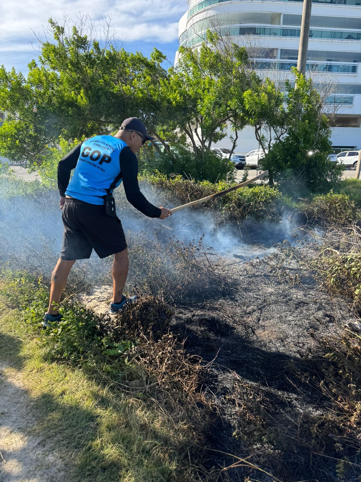 A Guarda Civil Municipal de Cabo Frio, por meio do Grupamento Operacional de Praia (GOP), atuou na tarde desta quinta-feira (15) no combate a focos de incêndio na vegetação da Avenida Litorânea, na Praia do Forte.