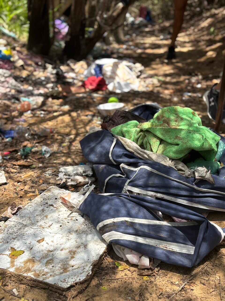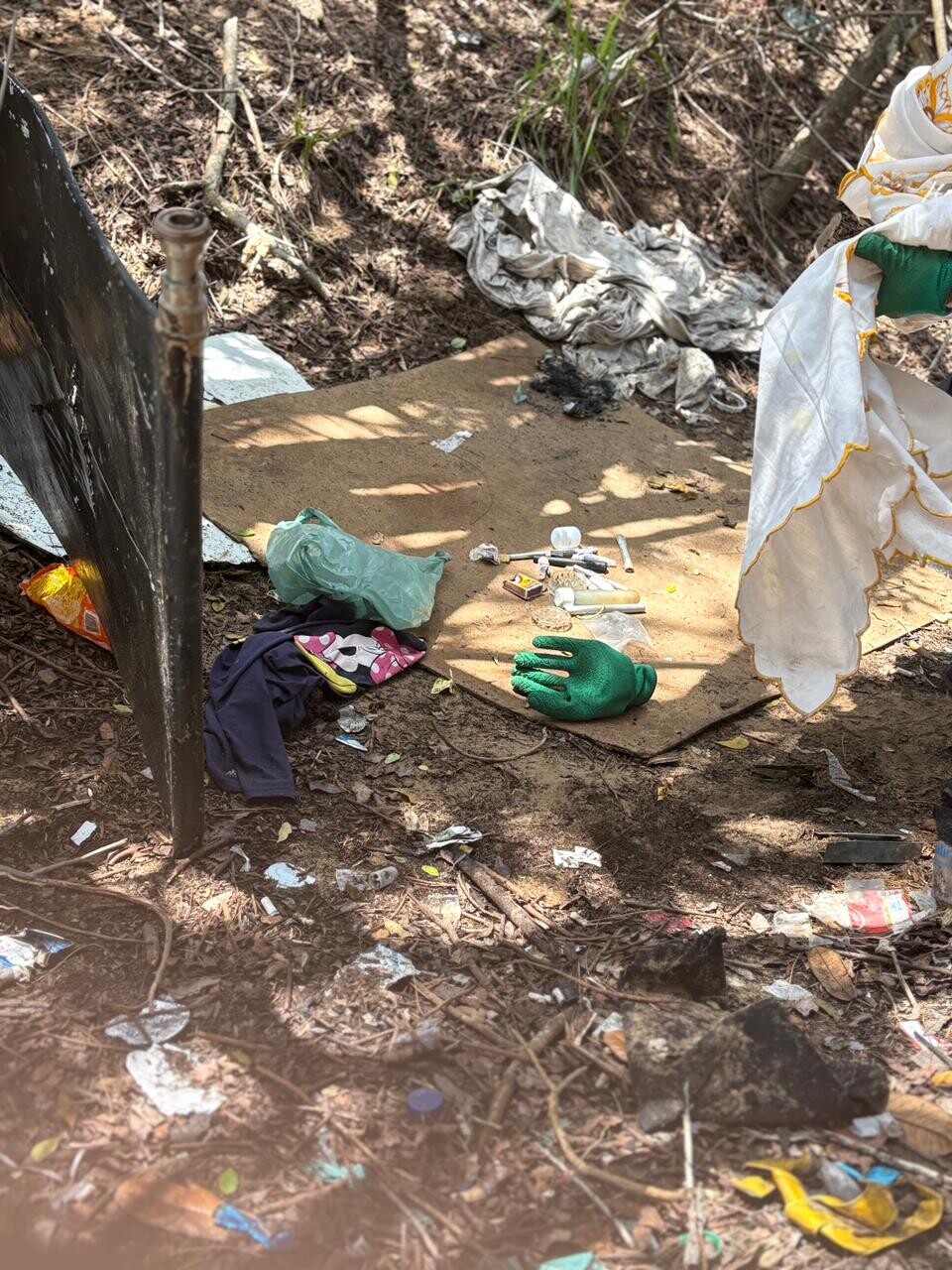 Em outro ponto, mais ao interior da mata, a Guarda encontrou acampamentos improvisados. Havia garrafas de bebida, vestígios de drogas e objetos, como lona e travesseiro. Ninguém foi localizado. Todo o material foi recolhido e, devido à grande quantidade de lixo espalhado, a Comsercaf foi acionada para realizar a limpeza da área.