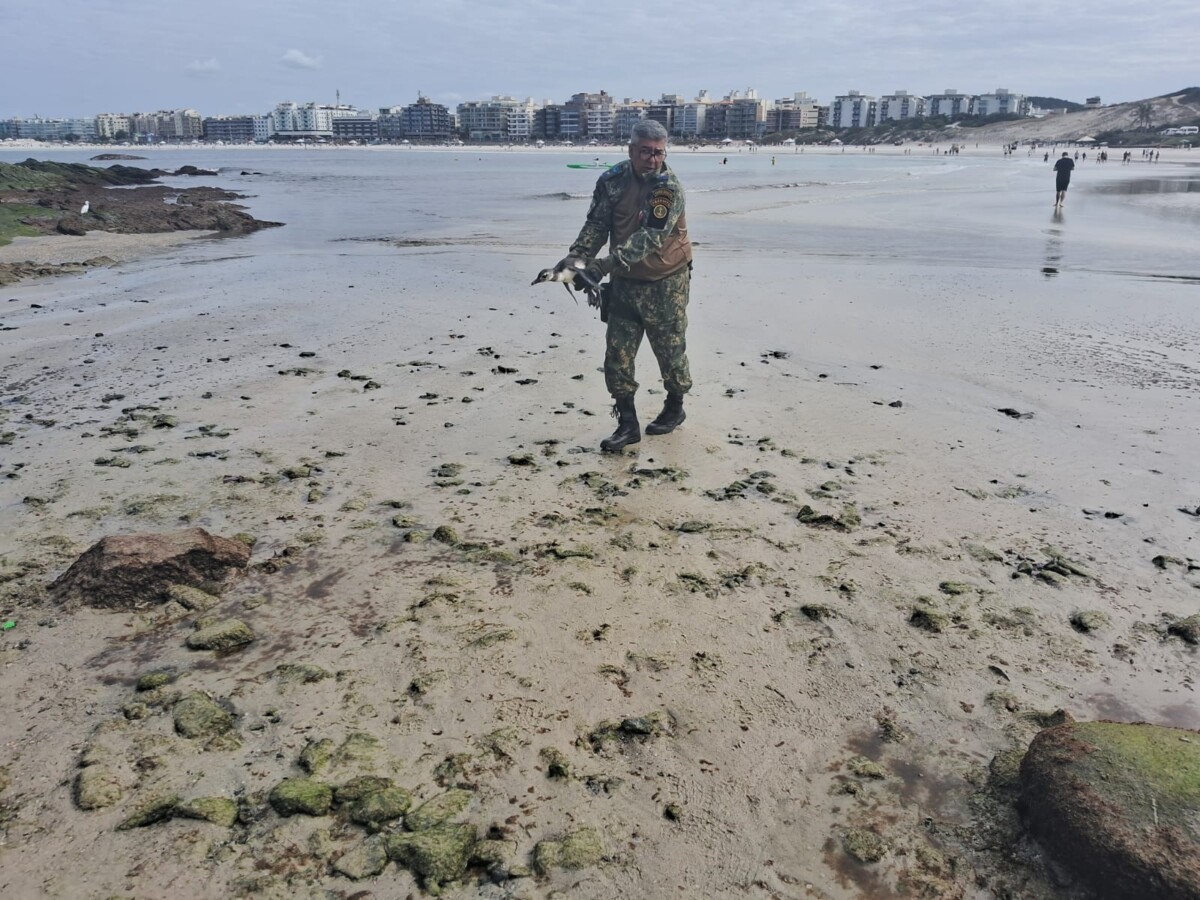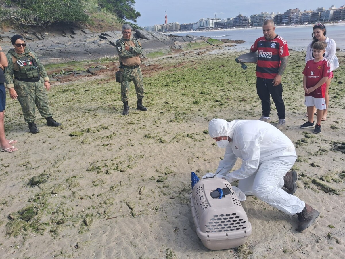 Durante patrulhamento de rotina na areia, no sábado (12), a Guarda Civil Municipal de Cabo Frio foi surpreendida com a presença de um pinguim debilitado em meio aos banhistas na Praia do Forte.