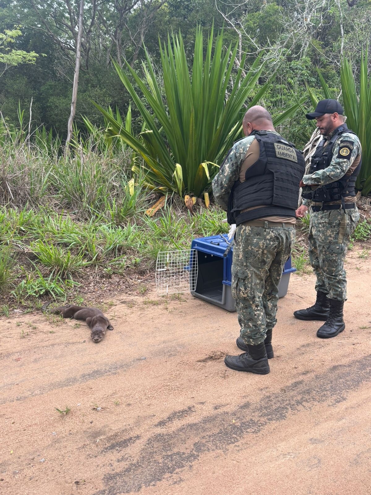 Pouco depois, a equipe foi acionada para uma ocorrência na Rua do Ipê-Amarelo, onde uma lontra foi encontrada gravemente ferida em via pública. Animal semiaquático que vive próximo a rios, lagoas e áreas costeiras, a lontra foi resgatada e levada ao Instituto BW para atendimento veterinário. A avaliação inicial aponta que o ferimento apresenta características compatíveis com disparo de arma de fogo.