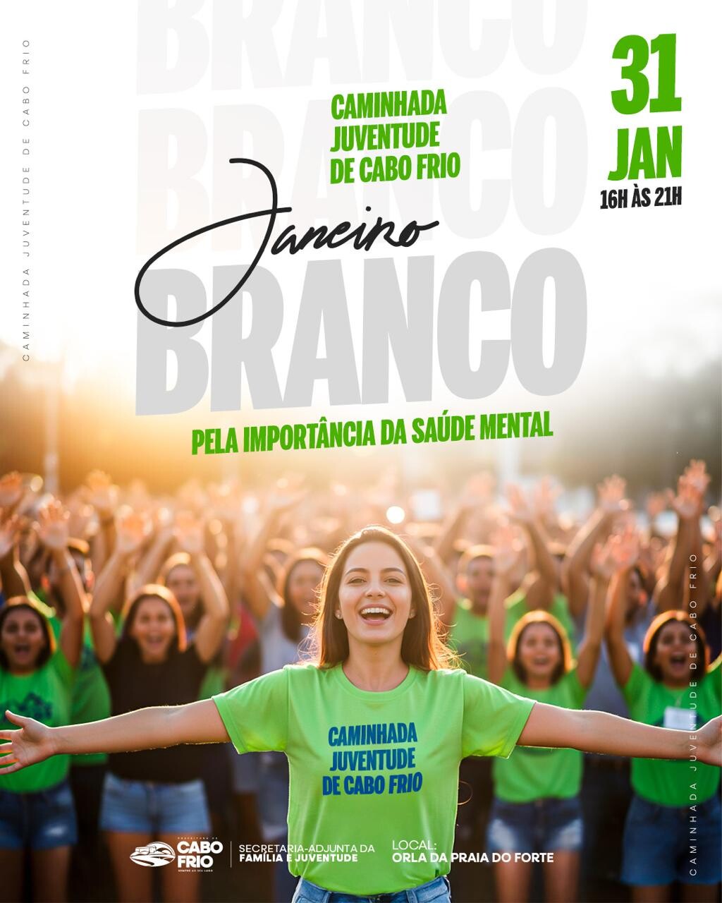 Em alusão ao Janeiro Branco, campanha dedicada à conscientização e ao cuidado com a saúde mental, a Prefeitura de Cabo Frio, por meio da Secretaria Adjunta da Família e Juventude, realiza, em parceria com o Grupo Missão Calebe, uma caminhada que une fé, esperança e celebração da vida. A iniciativa acontece no próximo sábado (31), das 16h às 21h, na orla da Praia do Forte, com foco na promoção do bem-estar e na valorização de práticas saudáveis entre os jovens.