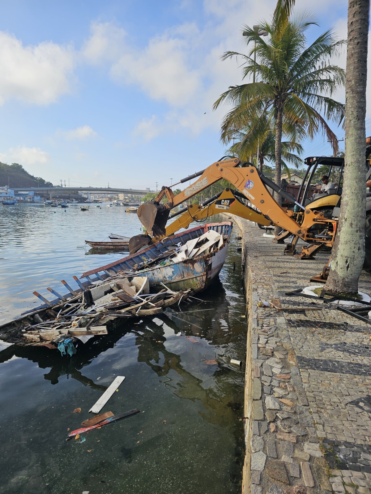 Uma embarcação abandonada foi removida com o auxílio de máquinas da Comsercaf. O barco, que vinha sendo usado irregularmente como depósito de lixo, representava um risco ambiental e comprometia a navegabilidade do canal.