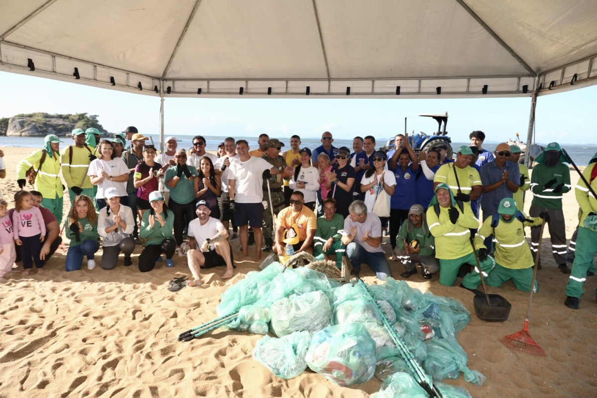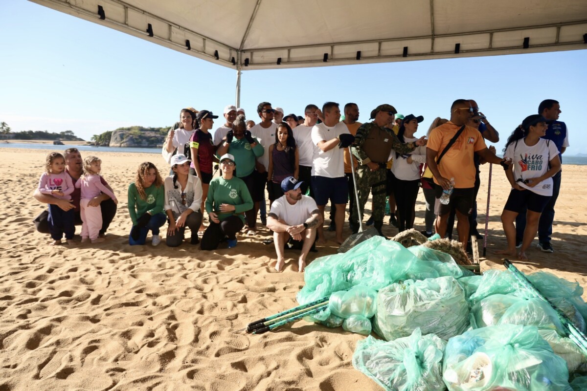 Puxando o grupo de limpeza na praia, o prefeito de Cabo Frio, Dr. Serginho, reforçou a necessidade de conscientização e participação coletiva no cuidado com o meio ambiente.
