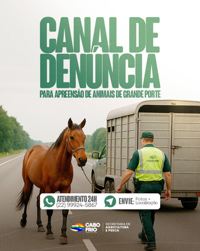 A partir desta terça-feira (10), a população de Cabo Frio conta com um canal exclusivo para denúncias de animais de grande porte soltos em vias públicas. O serviço será feito por WhatsApp, com atendimento 24 horas por dia, por meio do número (22) 99924-5867. A iniciativa é da Secretaria Municipal de Agricultura e Pesca.