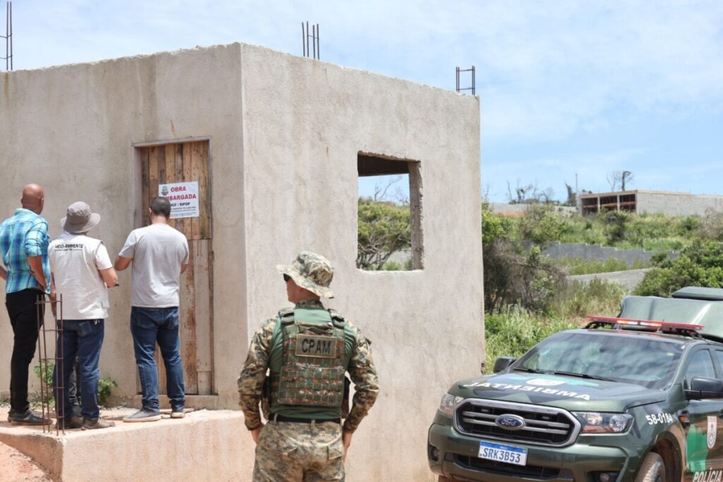 Já no Alto da Rasa, na região de Maria Joaquina, a operação deu continuidade ao monitoramento de um loteamento irregular no topo das falésias, área que está embargada desde 2019. O local tem histórico de desmatamento, movimentação de terra e construções irregulares e, apesar de notificações anteriores, a ocupação continuava avançando. Durante a ação, foram aplicados oito embargos em novas construções, e a Secretaria de Obras notificou o responsável a apresentar as devidas licenças, além de determinar a paralisação imediata do loteamento.