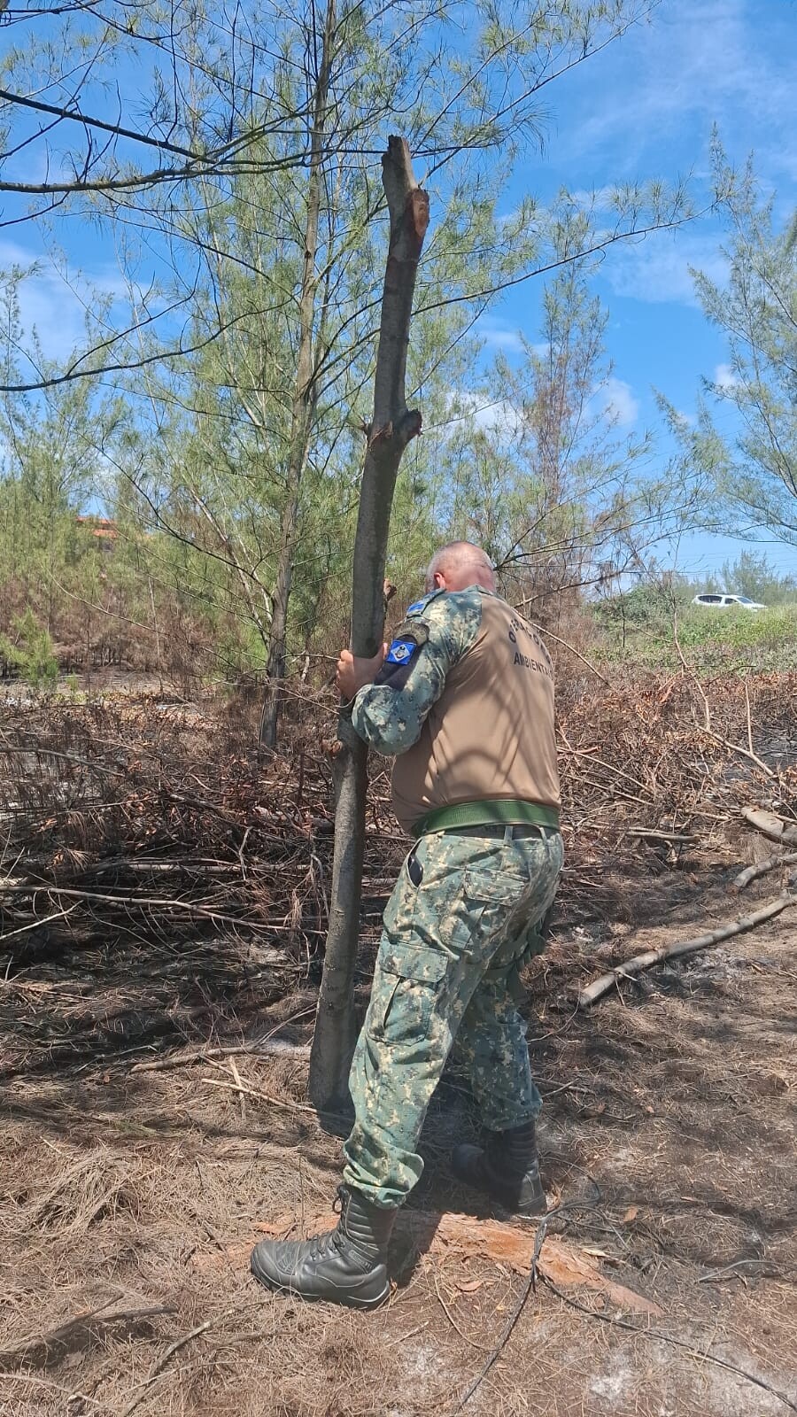 Durante a vistoria, as equipes constataram parcelamento irregular do solo, supressão e queima de vegetação nativa, cercamento irregular utilizando árvores da própria área e quatro sapatas de concreto armado, caracterizando início de construção sem licença ambiental. No total, foram identificadas 11 árvores cortadas e queimadas. No local, a equipe também controlou um início de incêndio, evitando que o fogo se espalhasse.