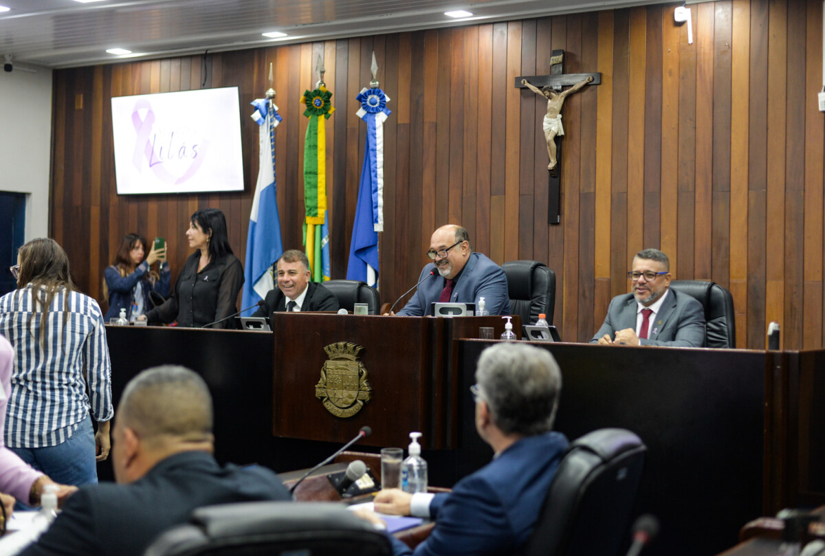 A solenidade marcou a primeira sessão do segundo semestre na Câmara Municipal e reuniu parlamentares, secretários municipais, o vice-prefeito Miguel Alencar, além de representantes da rede de proteção à mulher e membros da sociedade civil.