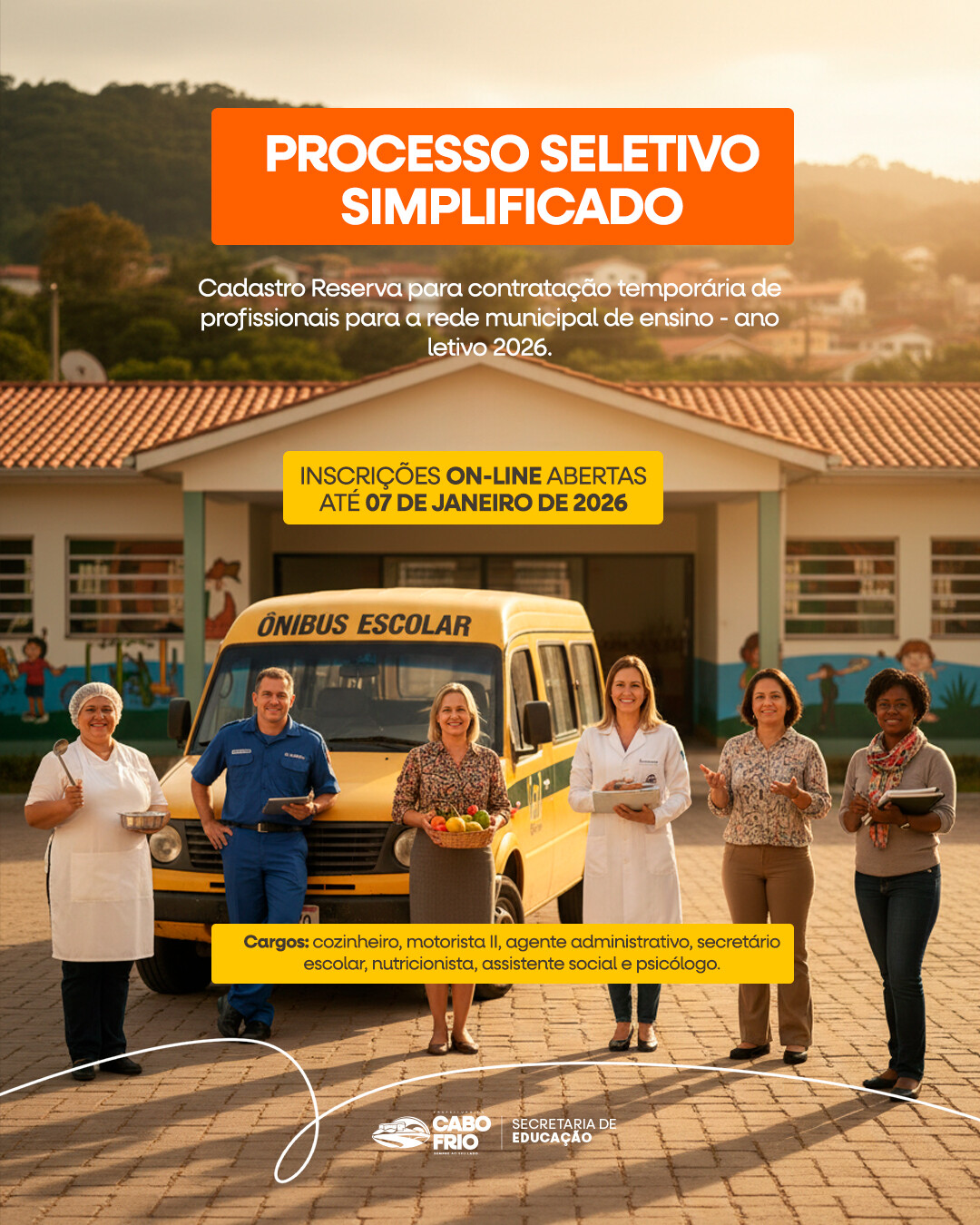 A Prefeitura de Cabo Frio, por meio da Secretaria de Educação, vai abrir nesta quarta-feira (31), a partir das 12h, as inscrições para o Processo Seletivo Simplificado. A seleção pública, regida pelo Edital nº 095/2025, é destinada à formação de cadastro reserva para contratação temporária de profissionais para a rede pública municipal de ensino para atuação no ano letivo de 2026. O processo contempla os cargos de cozinheiro, motorista II, agente administrativo, secretário escolar, nutricionista, assistente social e psicólogo.