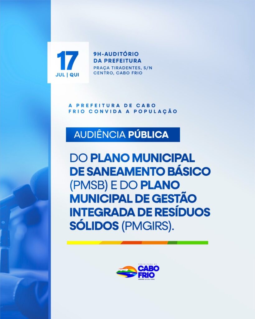 A Prefeitura de Cabo Frio quer ouvir a população para construir, de forma participativa, o futuro do saneamento básico e da gestão de resíduos da cidade. Para isso, será realizada uma audiência pública nesta quinta-feira (17), às 9h, no auditório da sede do governo municipal.