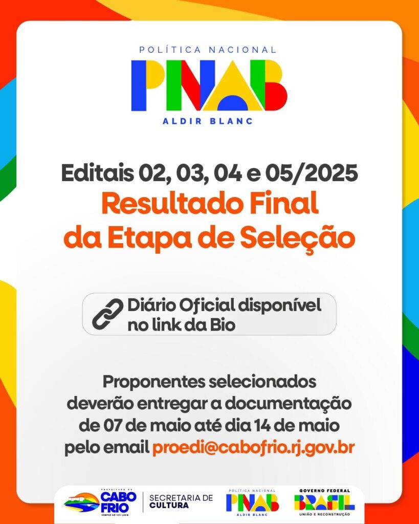 A Prefeitura Municipal de Cabo Frio, por meio da Secretaria Municipal de Cultura, divulgou nesta terça-feira (6), o resultado de recurso, o resultado final da etapa de seleção e o edital de convocação referentes aos editais nº 02, 03, 04 e 05/2025 da Política Nacional Aldir Blanc (PNAB).