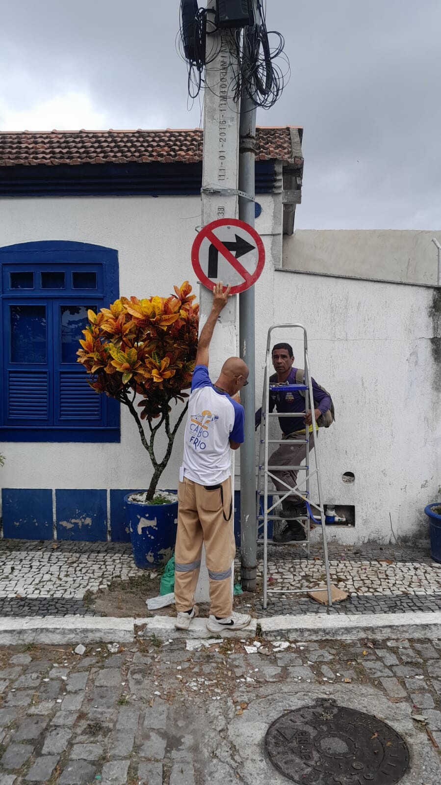 A Prefeitura de Cabo Frio, por meio da Secretaria de Mobilidade Urbana, iniciou nesta sexta-feira (10) a instalação de sinalização vertical no entorno do Largo de São Benedito, no bairro da Passagem. A medida é necessária para a implantação da mão invertida em duas vias importantes da região: a Rua Maestro Clodomiro Guimarães e a Avenida Almirante Barroso.