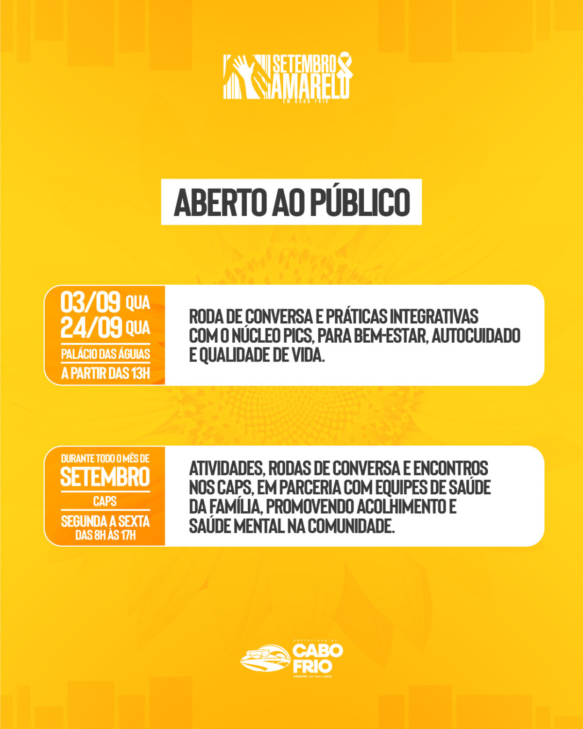 “Se precisar, peça ajuda”! Esse é o slogan 2025 de uma campanha mundial que traz à tona um tema sensível e, ao mesmo tempo, impactante sobre a prevenção ao suicídio e valorização da vida. Intitulada “Setembro Amarelo”, a campanha, vigente no Brasil há mais de dez anos, será realizada em Cabo Frio pela Prefeitura com ações ao longo de todo o mês.