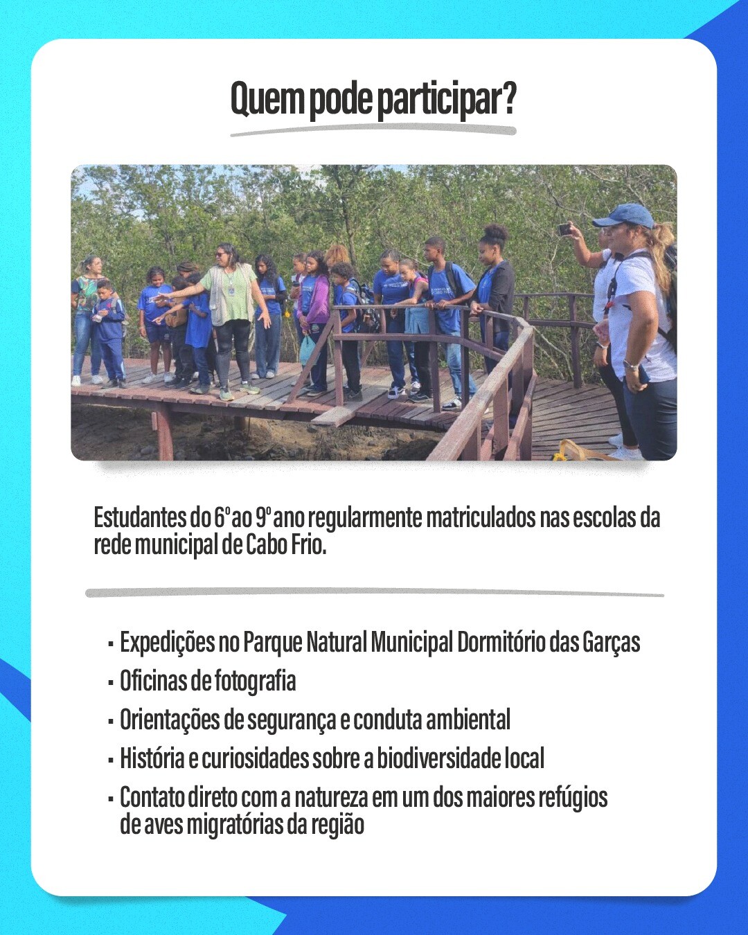 Durante a expedição, os alunos receberão orientações de segurança, conduta, preservação e boas práticas de observação da fauna, além de participarem de oficinas de fotografia. As fotos produzidas pelos estudantes serão encaminhadas à Secretaria de Educação pelas unidades escolares e, após seleção, publicadas no perfil oficial da Secretaria de Educação no Instagram para votação pública.