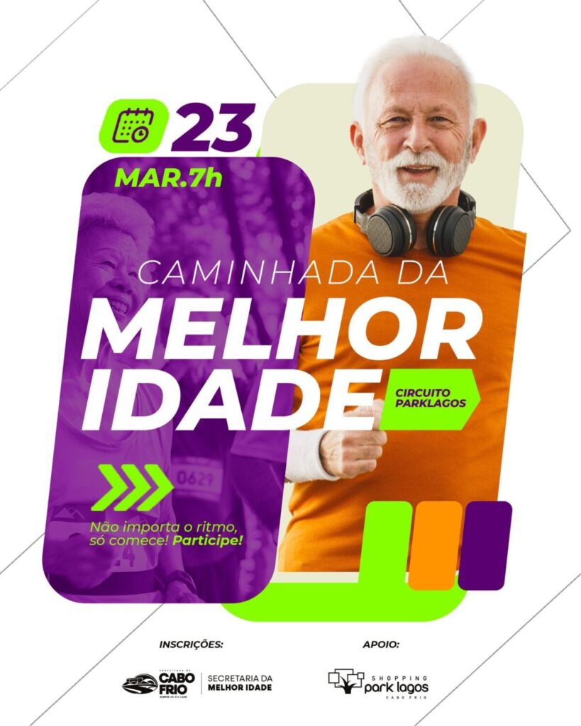 A Prefeitura de Cabo Frio, por meio da Secretaria da Melhor Idade, em parceria com o Circuito Park Lagos, promove a Caminhada da Melhor Idade no próximo domingo (23). O percurso será de 5 km, com concentração e largada às 7h no circuito do Park Lagos.