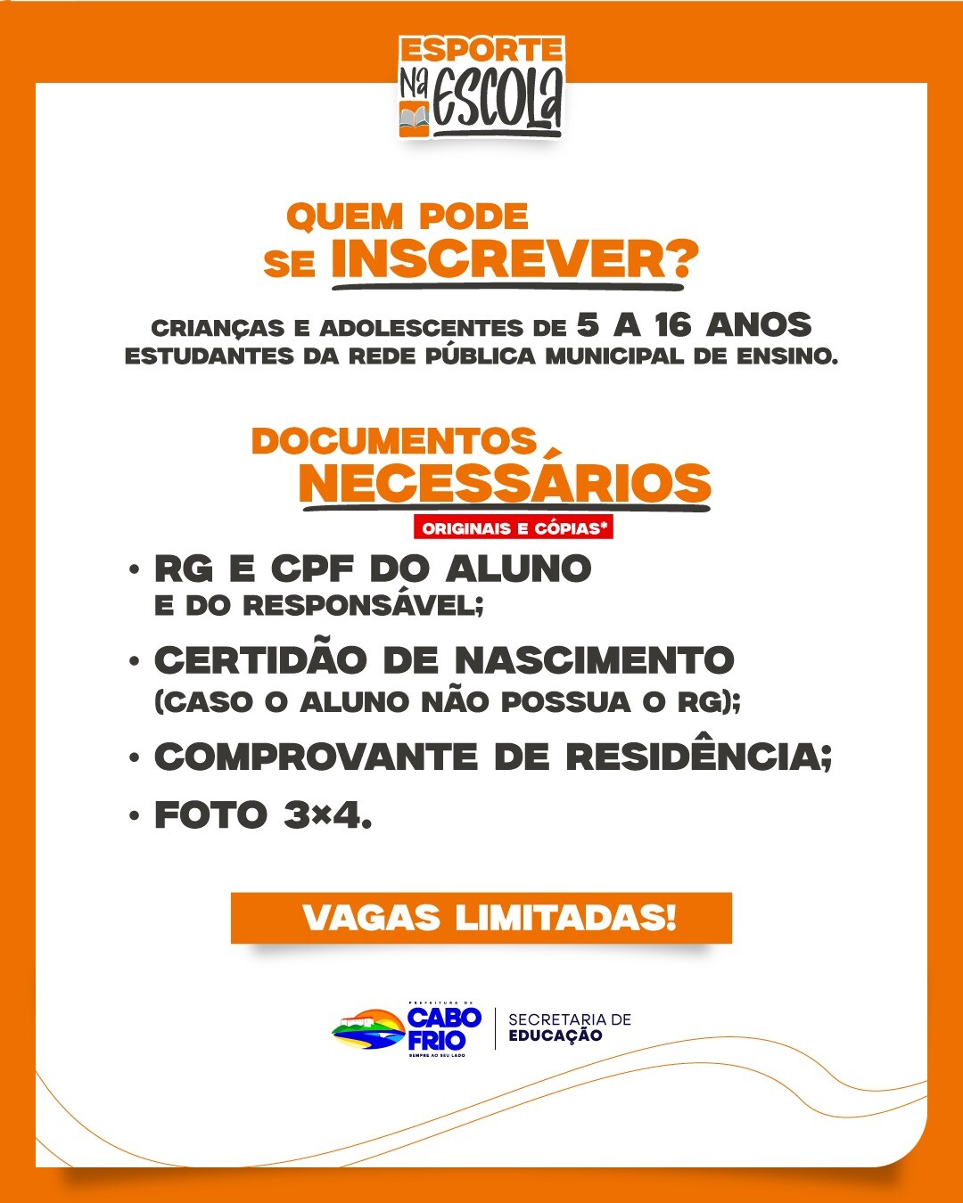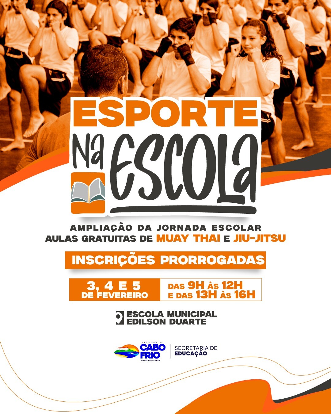A Prefeitura de Cabo Frio, por meio da Secretaria de Educação, prorrogou o prazo de inscrições para o projeto “Esporte na Escola: Ampliação da Jornada Escolar”. Os pais e responsáveis que ainda não efetivaram a matrícula do aluno terão, ainda, os dias 03, 04 e 05 de fevereiro para comparecer à Escola Municipal Edilson Duarte, no bairro Jardim Caiçara, com os documentos exigidos. O atendimento ocorrerá das 9h às 12h e das 13h às 16h.