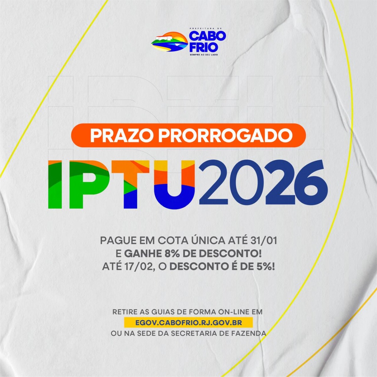 • Prefeitura de Cabo Frio prorroga prazo de pagamento do IPTU 2026 com desconto