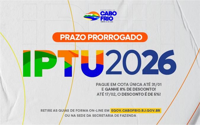 Os contribuintes de Cabo Frio ganharam mais um tempo para pagar o IPTU 2026 com desconto. A Prefeitura prorrogou o prazo de pagamento em cota única até 31 de janeiro, com redução de 8% no valor. Após essa data, o desconto é de 5% para quem quitar o imposto à vista, até 17 de fevereiro. A prorrogação foi publicada nesta terça-feira (20), na edição 015/2026 do Diário Oficial do Município.