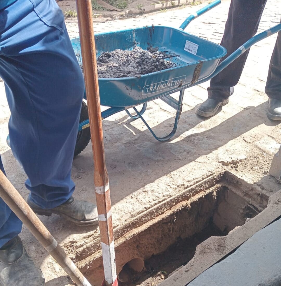 No bairro Guarani, as equipes atuaram na Rua Visconde de Cairu, onde foi realizada a reconstrução de uma caixa de passagem que estava danificada. A estrutura comprometida afetava o funcionamento adequado do sistema de escoamento pluvial, exigindo intervenção técnica para restabelecer a eficiência da rede.
