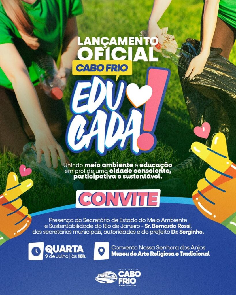 A Prefeitura de Cabo Frio, por meio da Secretaria de Meio Ambiente, Saneamento e Clima, promove nesta quarta‑feira (9), às 10 h, no Convento Nossa Senhora dos Anjos – Museu de Arte Religiosa e Tradicional (Mart), o lançamento do programa Cabo Frio Educada. A iniciativa une meio ambiente e educação em prol de uma cidade cada vez mais consciente, participativa e sustentável. Toda a população, sociedade civil organizada e veículos de imprensa estão convidados para participar.