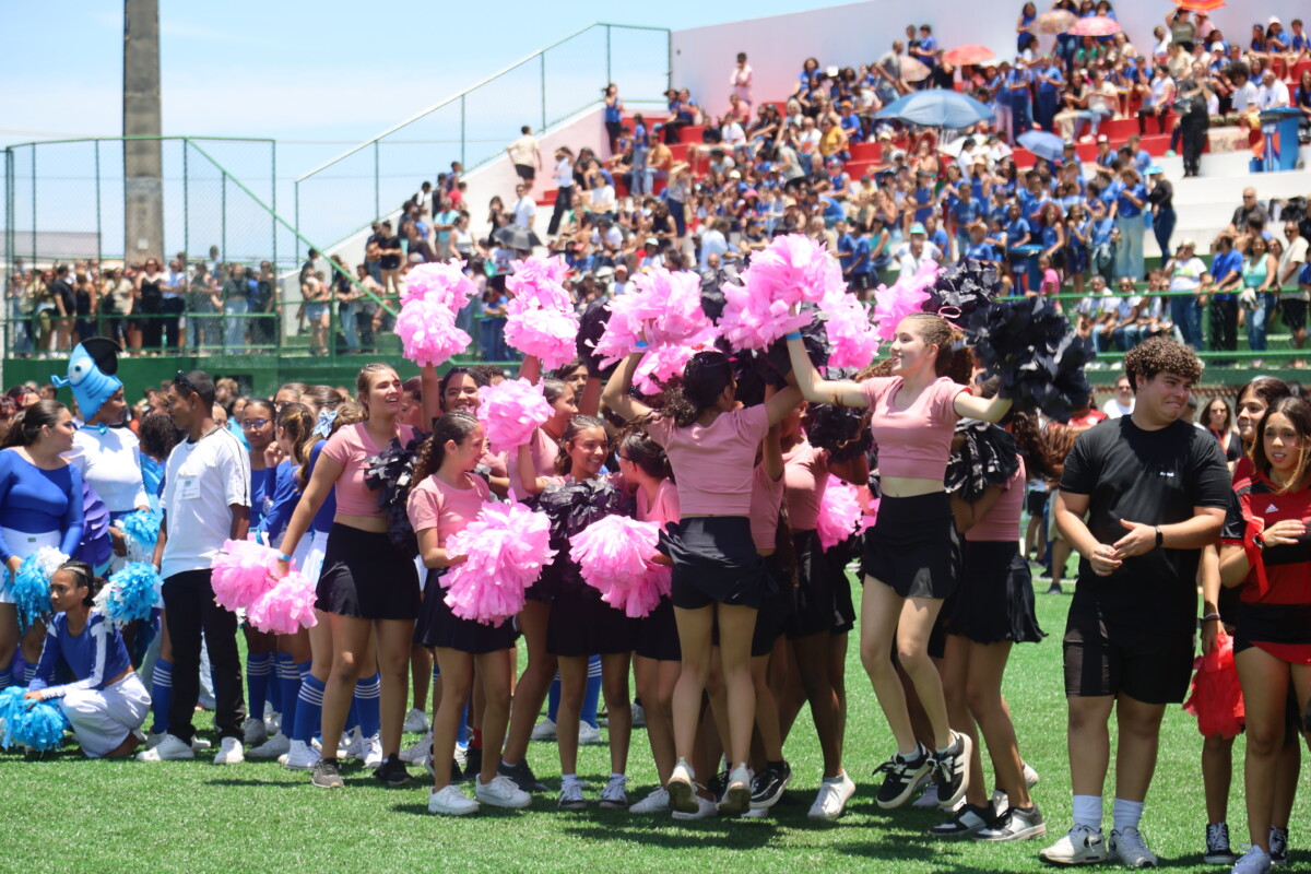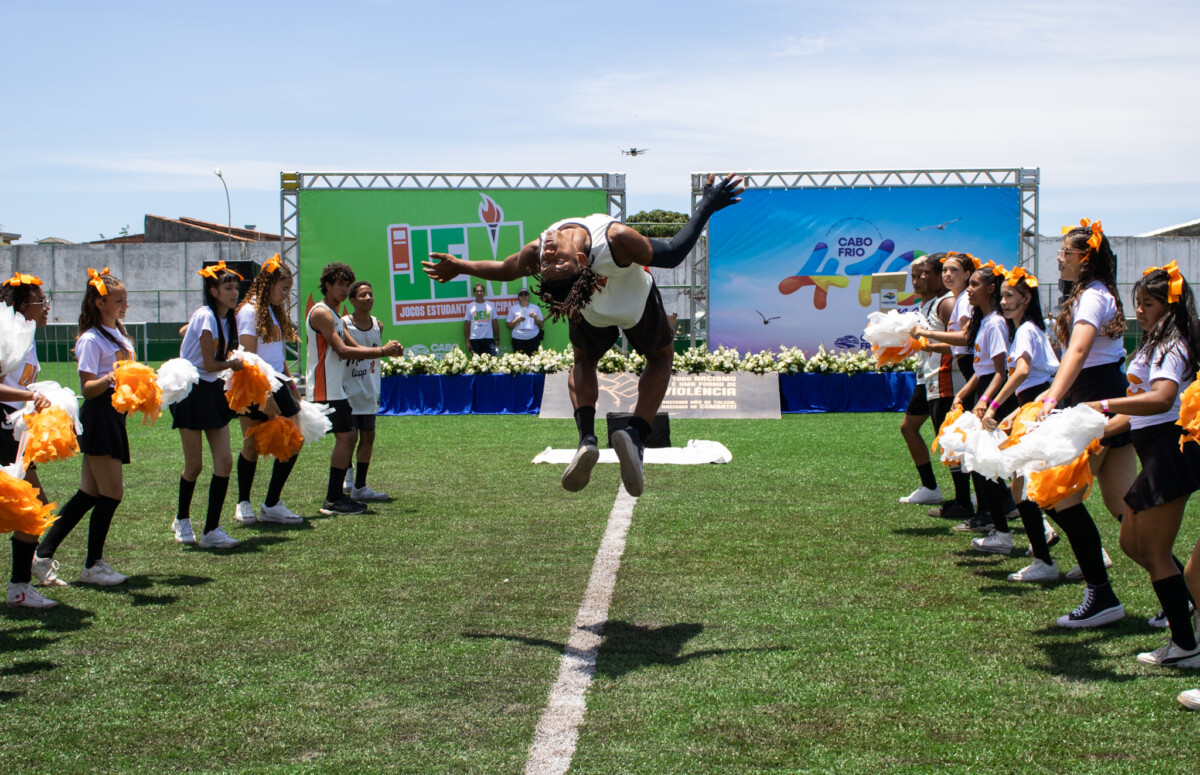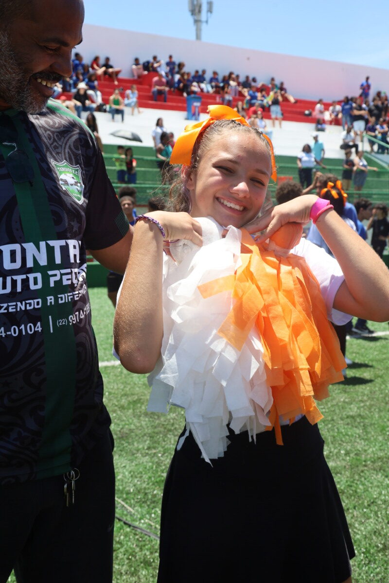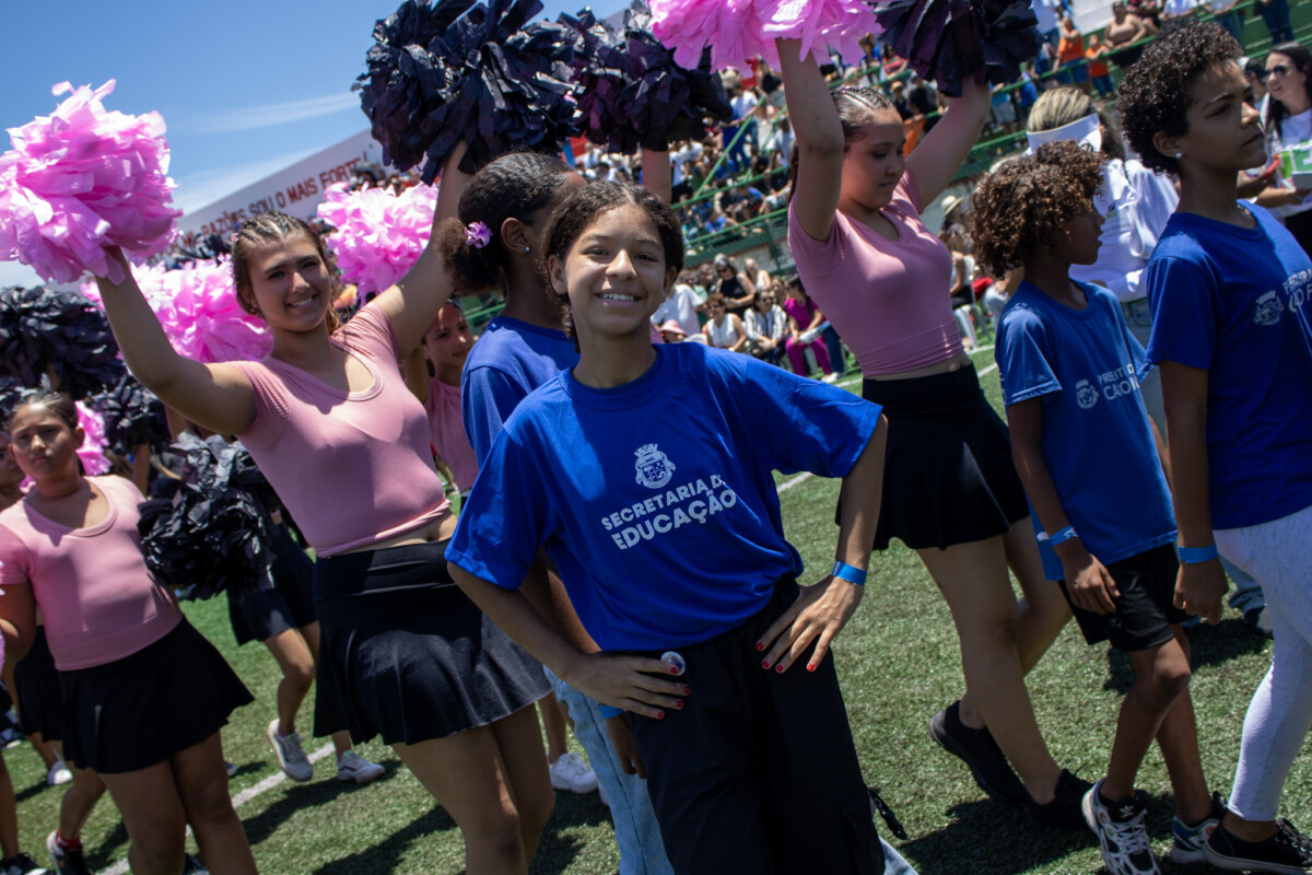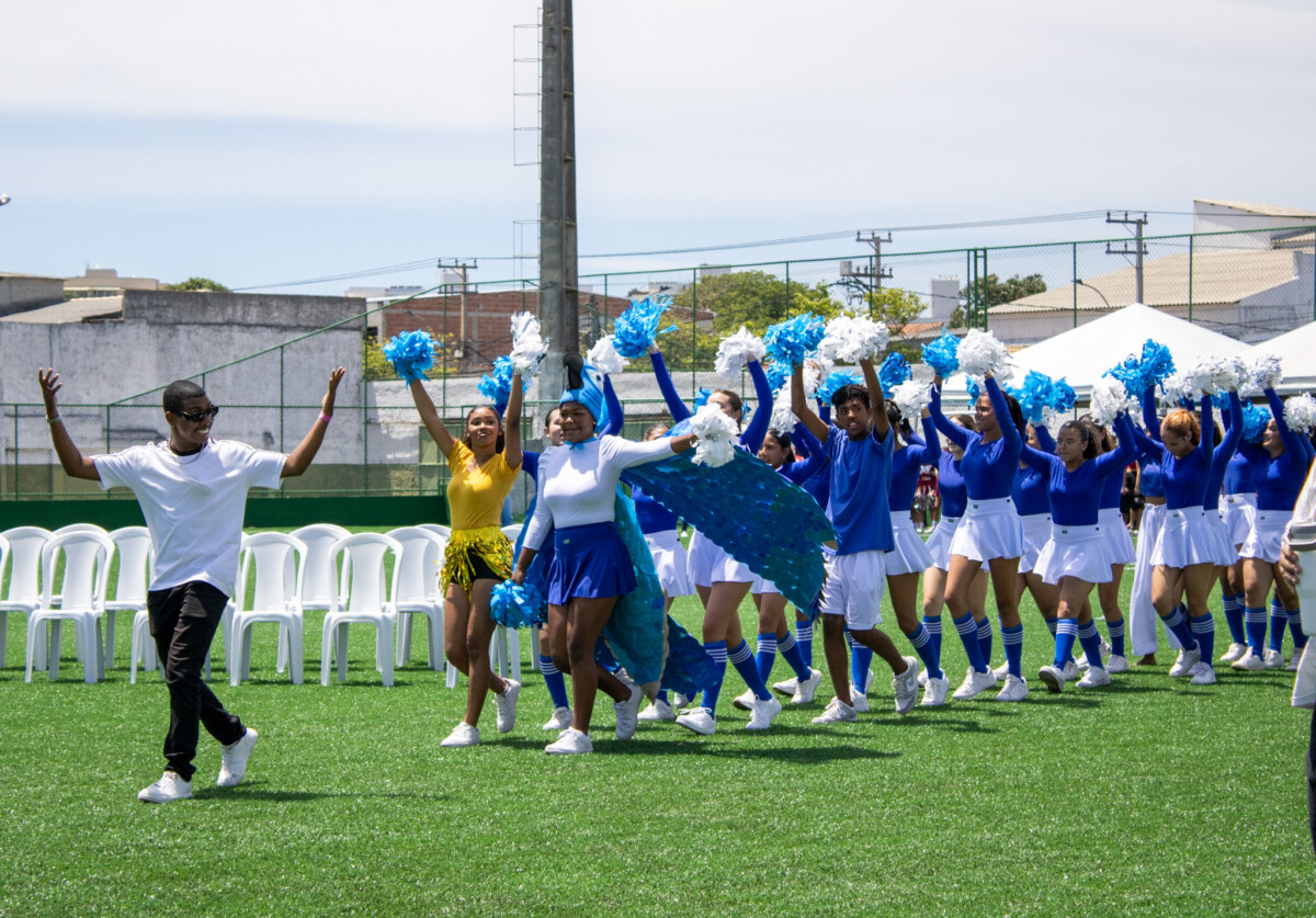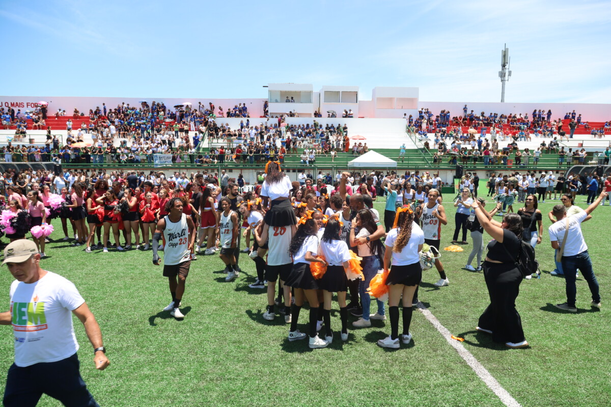 A cerimônia de premiação teve início com a mostra competitiva das equipes de cheerleaders, que deram um show de energia e empolgaram o público e as torcidas organizadas com coreografias vibrantes. Em seguida, alunos da Escola Municipal Professora Catharina da Silveira emocionaram os presentes com uma apresentação de dança em prol da “Educação Antirracista”, reforçando o compromisso da rede municipal com a educação para a igualdade racial e o respeito à diversidade.