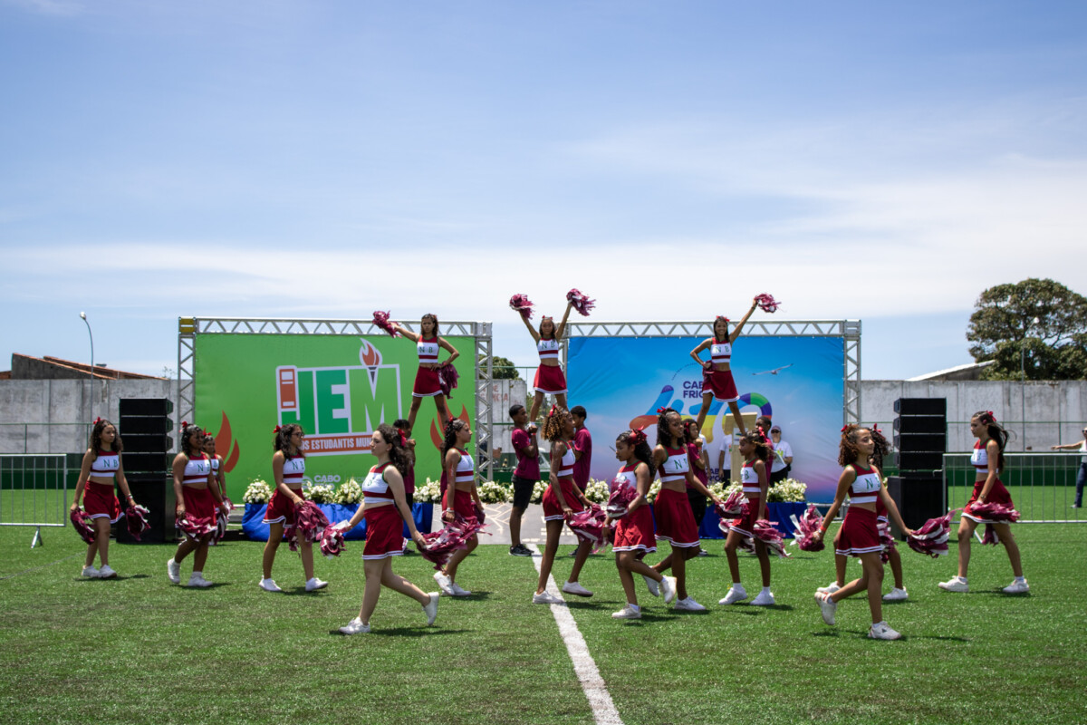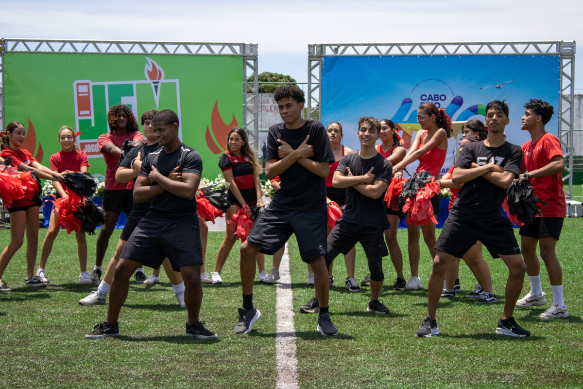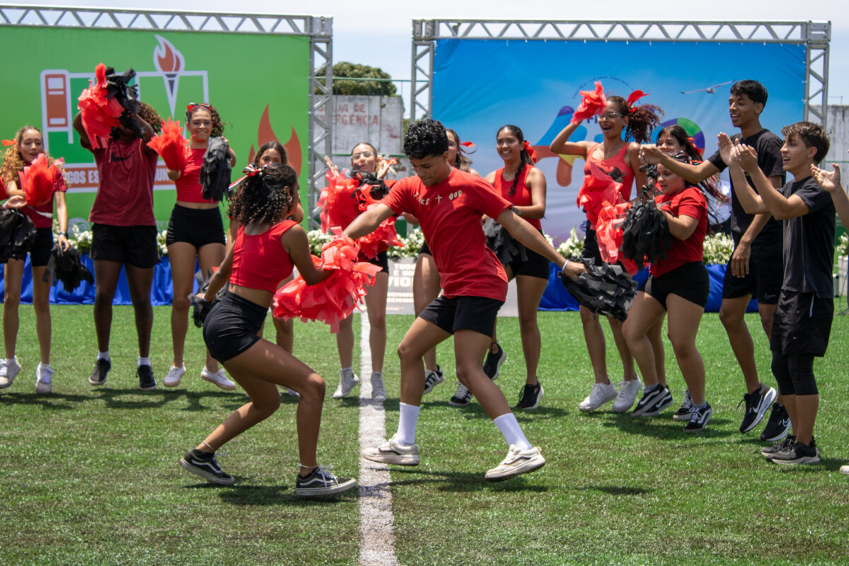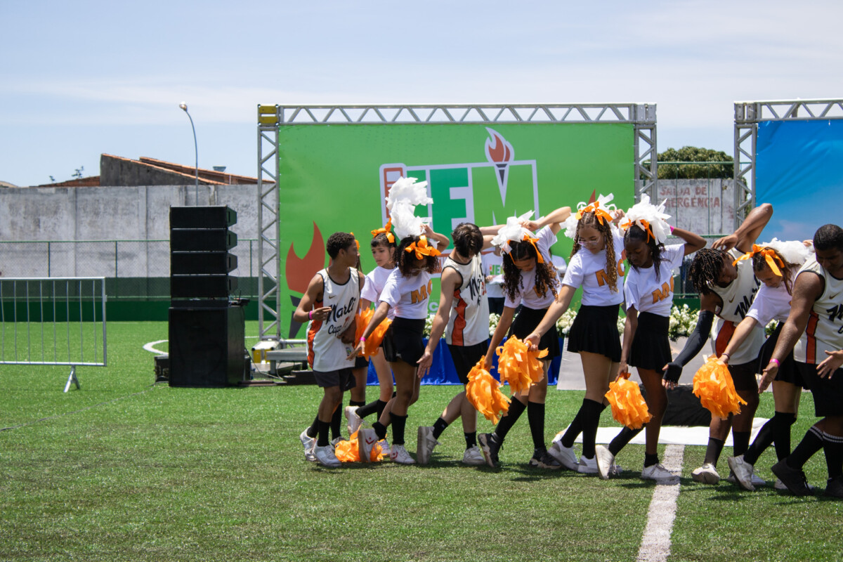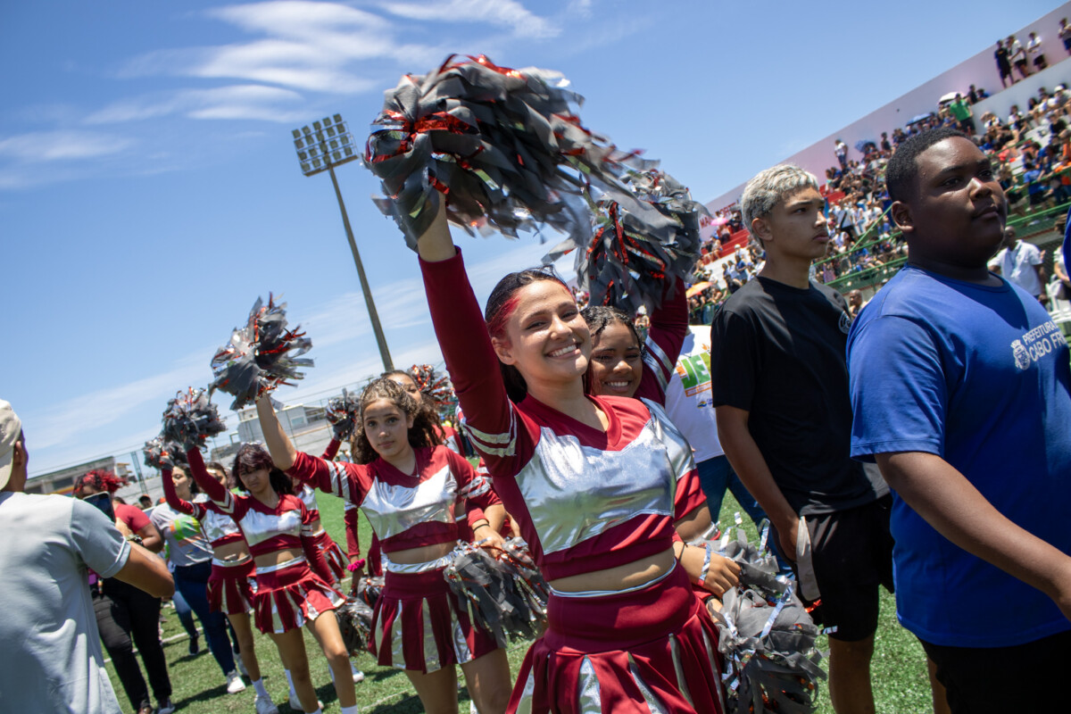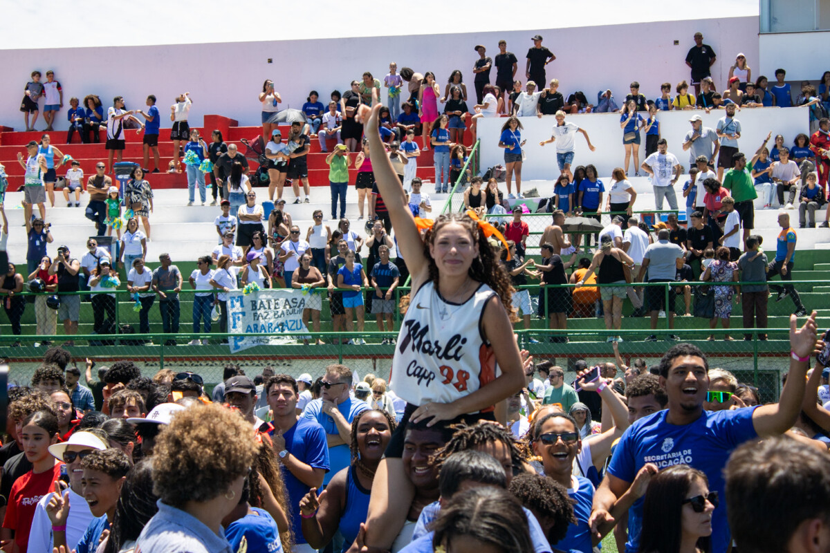 A cerimônia de premiação teve início com a mostra competitiva das equipes de cheerleaders, que deram um show de energia e empolgaram o público e as torcidas organizadas com coreografias vibrantes. Em seguida, alunos da Escola Municipal Professora Catharina da Silveira emocionaram os presentes com uma apresentação de dança em prol da “Educação Antirracista”, reforçando o compromisso da rede municipal com a educação para a igualdade racial e o respeito à diversidade.