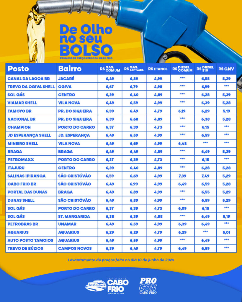 Dando prosseguimento ao monitoramento mensal dos valores cobrados nos postos de combustíveis do município, o Procon de Cabo Frio realizou, na terça-feira (10), uma ação de fiscalização para verificar se os estabelecimentos repassaram para os consumidores finais o desconto de 5,6% no preço de venda da gasolina, da Petrobras às distribuidoras, desde o último dia 3 de junho.