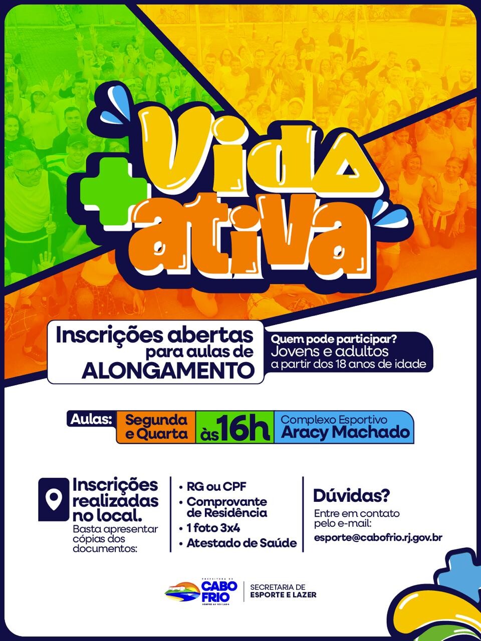 A Prefeitura de Cabo Frio, por meio da Secretaria de Esporte e Lazer, anuncia a abertura de novas inscrições para as aulas de alongamento do projeto Vida + Ativa. A iniciativa oferece diversas modalidades esportivas e recreativas gratuitas para a população.